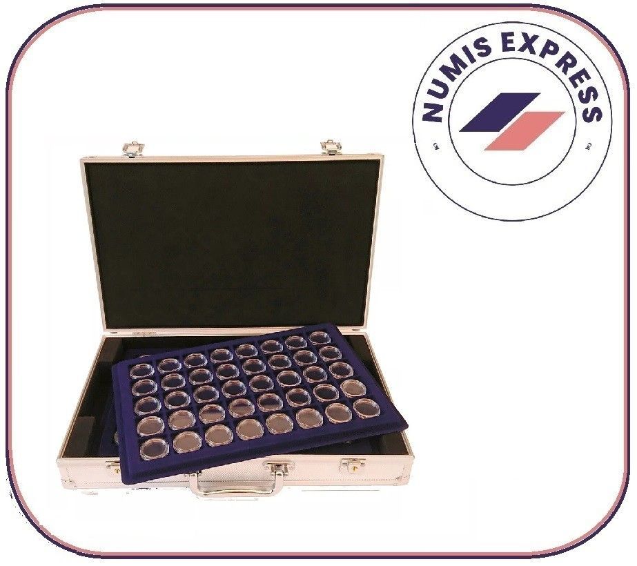 Aluminium Alu Münzkoffer mit 4 blauen Tableaus und Kapseln für 160 x 2 Euro