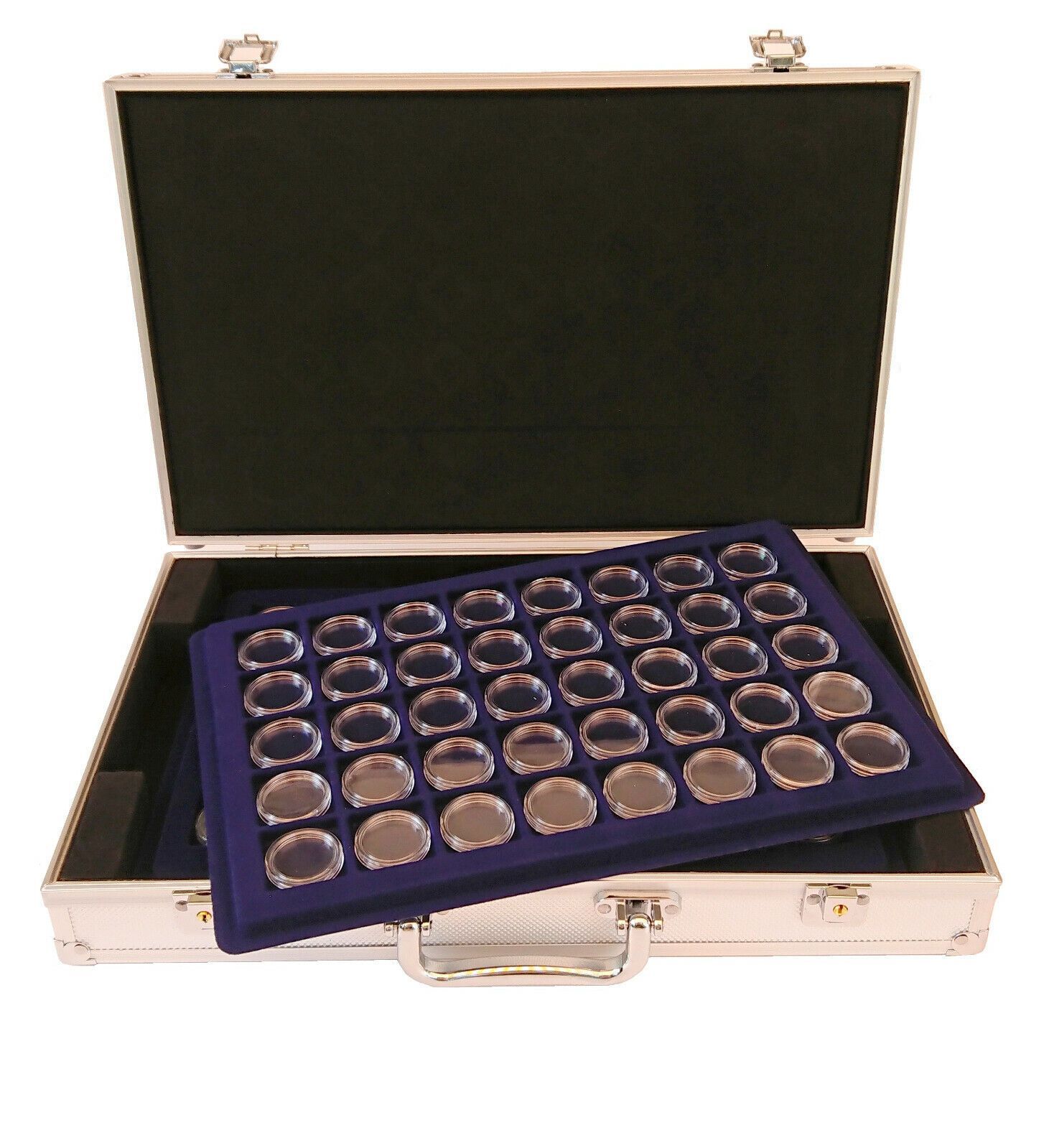Aluminium Alu Münzkoffer mit 4 blauen Tableaus und Kapseln für 160 x 2 Euro