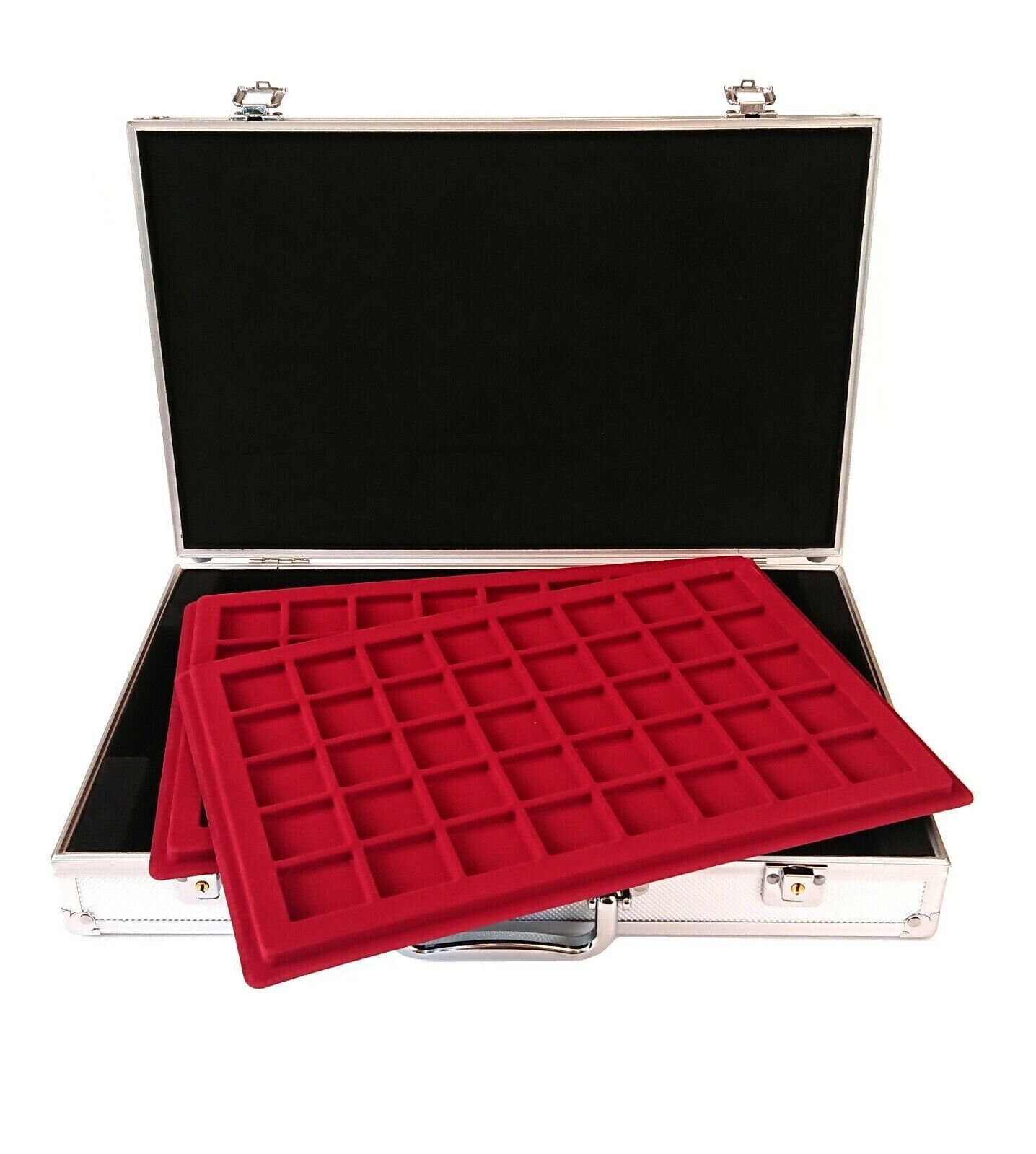Aluminium Alu Münzkoffer mit 4 roten Tableaus für 160 Münzen