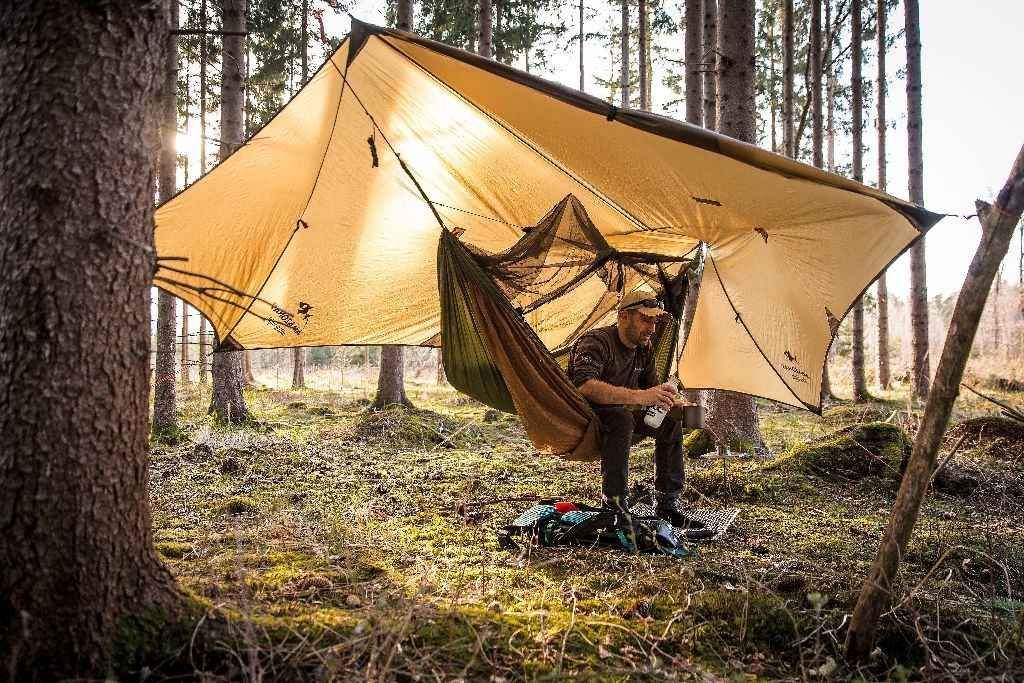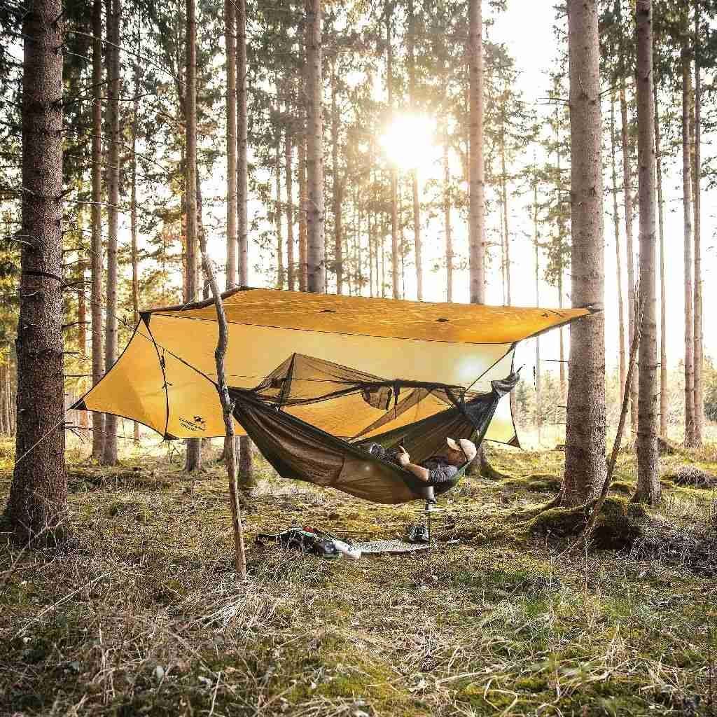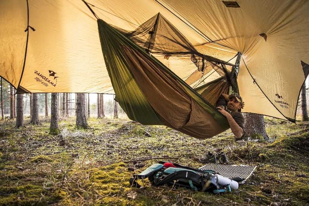 DAS ULTRALEICHTE HÄNGEMATTEN-TARP MIT VARIABLEM RUNDUM-WINDSCHUTZ Farbe braun Gewicht ca. 0.680000 kg Material nylon Material Detailinformationen Nylon 20D Ripstop Hersteller Amazonas Herkunft China Adventure Wing Tarp- ultraleichte Regenplane
