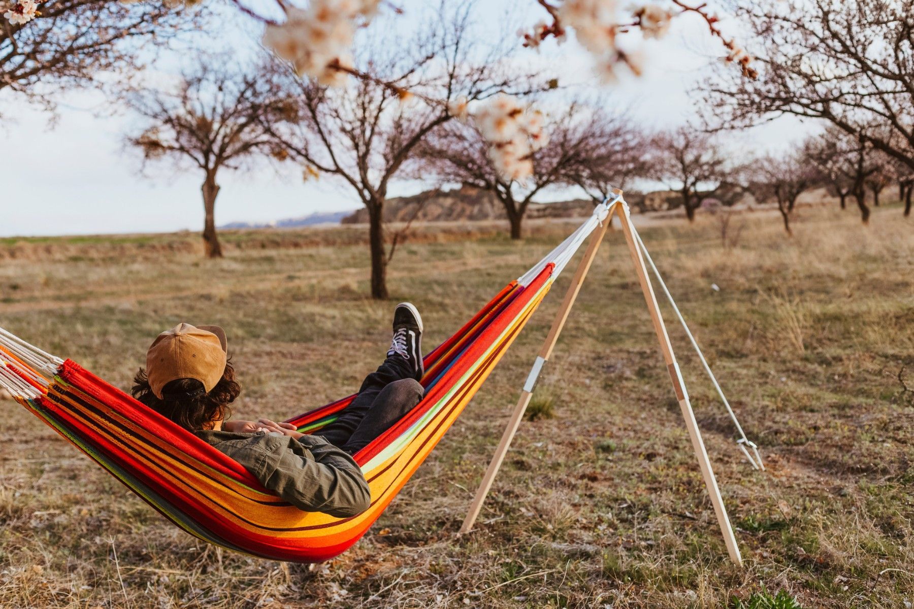 • Bitte stellen Sie sicher, dass die Hängematte nur an stabilen, tragfähigen Befestigungspunkten montiert wird. Vor jeder Nutzung sollten Aufhängung, Knoten und Stoff auf Abnutzung oder Schäden überprüft werden. Springen oder starkes Schaukeln vermeiden. Kinder dürfen die Hängematte nur unter Aufsicht verwenden.
