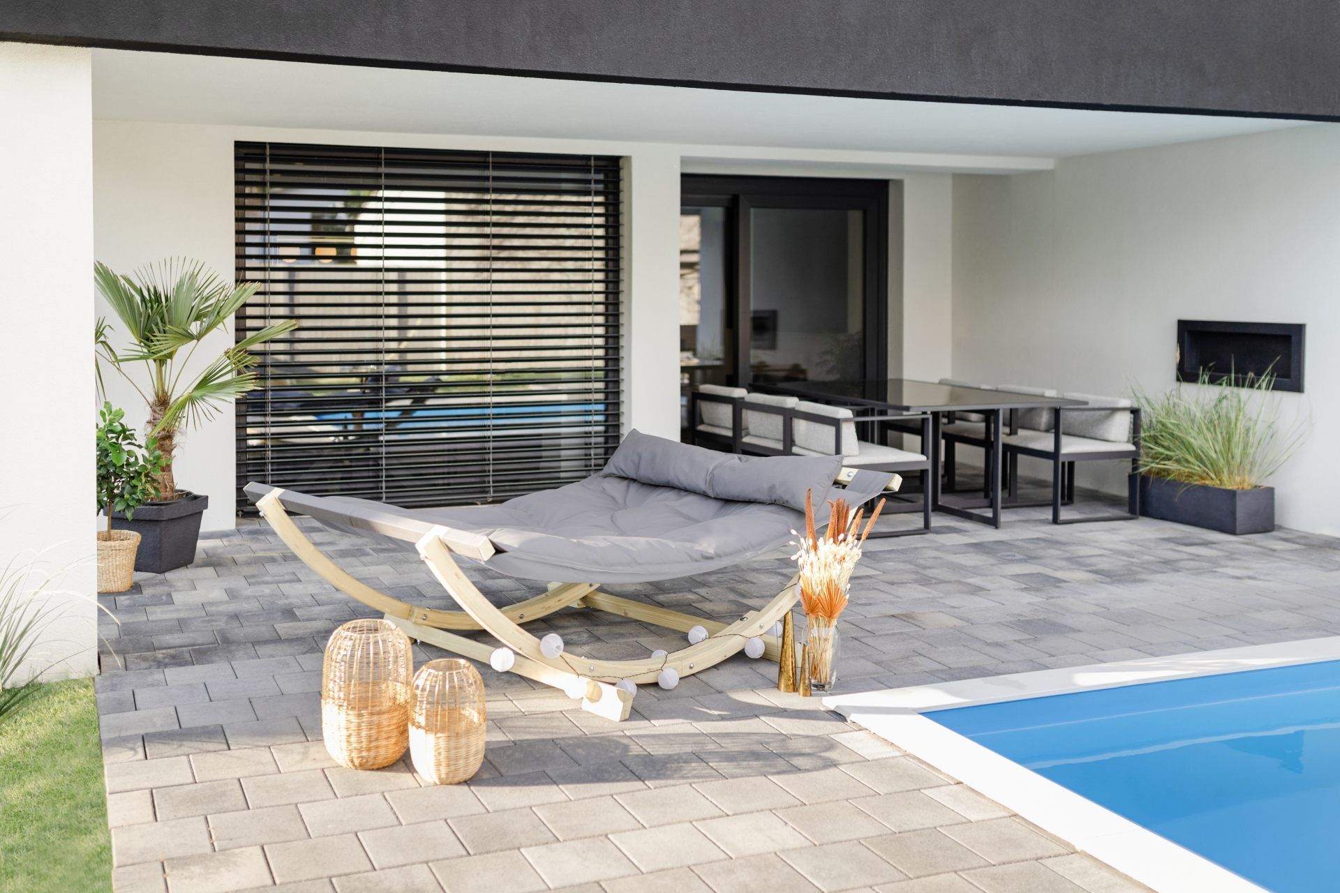 Das Lounge Bed ist dein stylisches Open-Air Sofa für die Terrasse oder dein Bett im Garten: Die schwebende Liegefläche ist extra dick, weich und gemütlich gepolstert, fast wie ein richtiges Bett. Es ist so groß, dass man darauf nicht nur allein, sondern auch zu zweit wunderbar relaxen oder ein Mitta