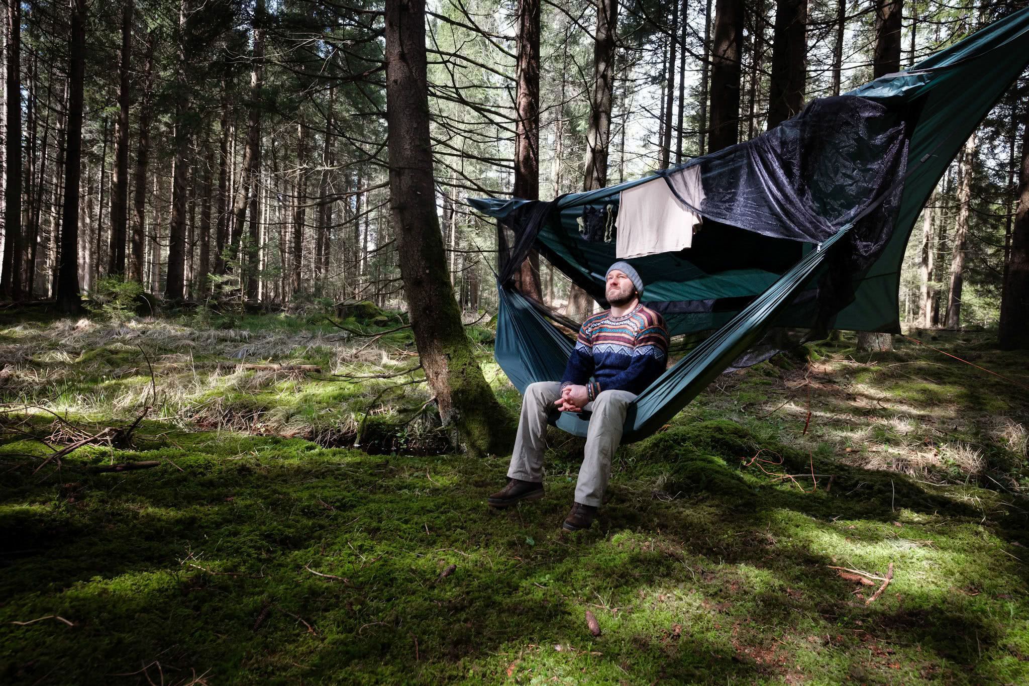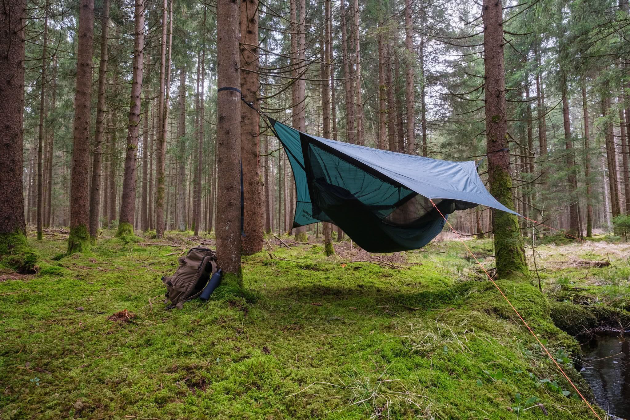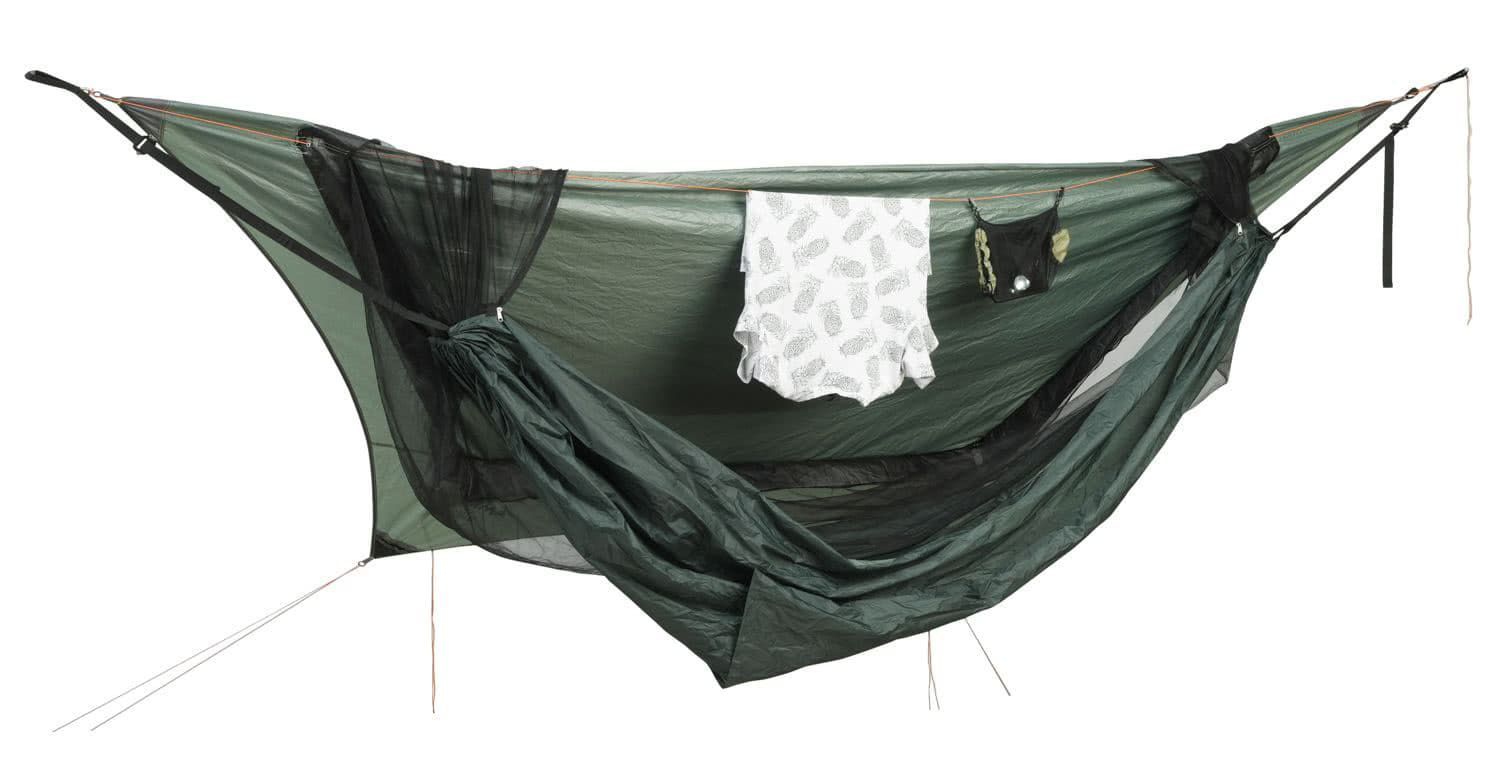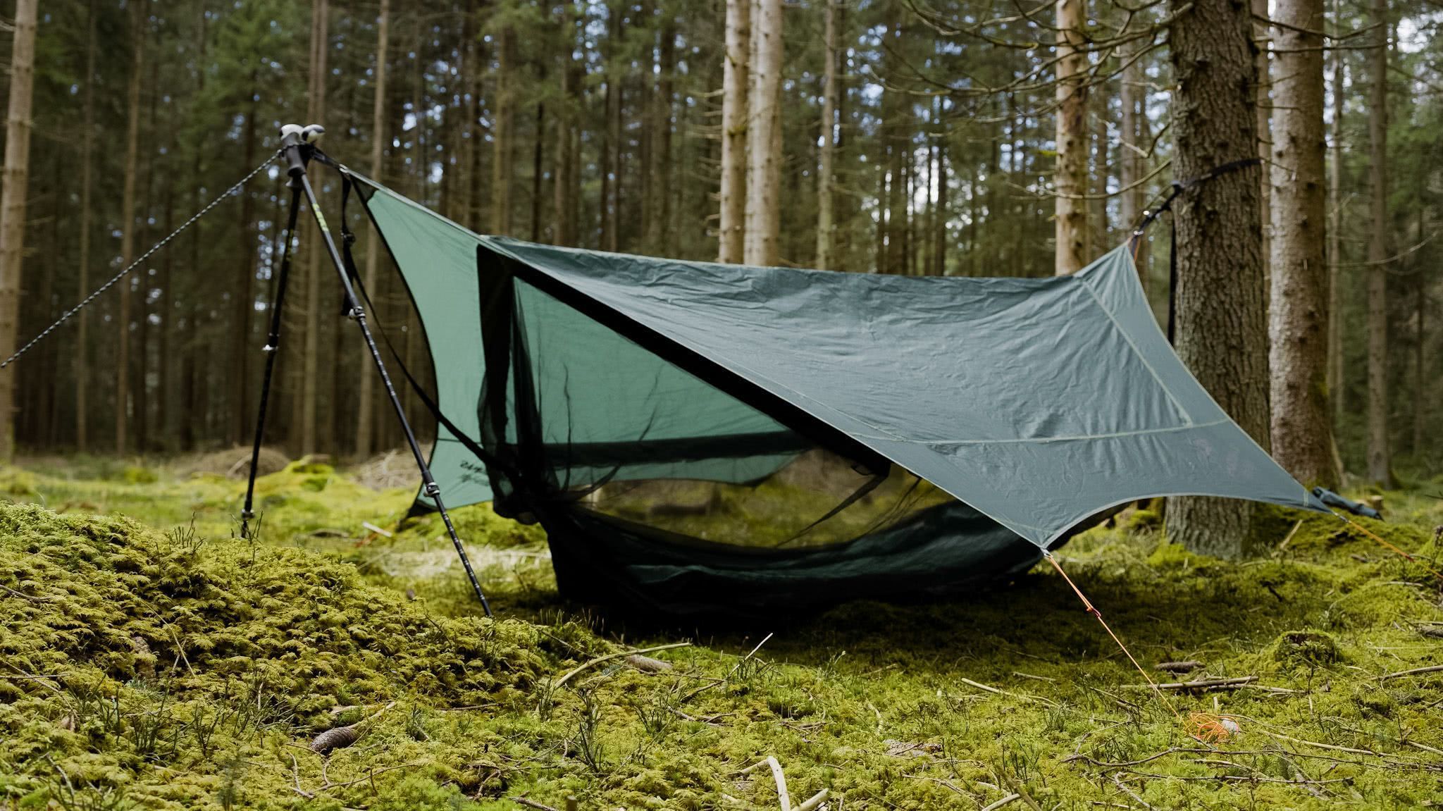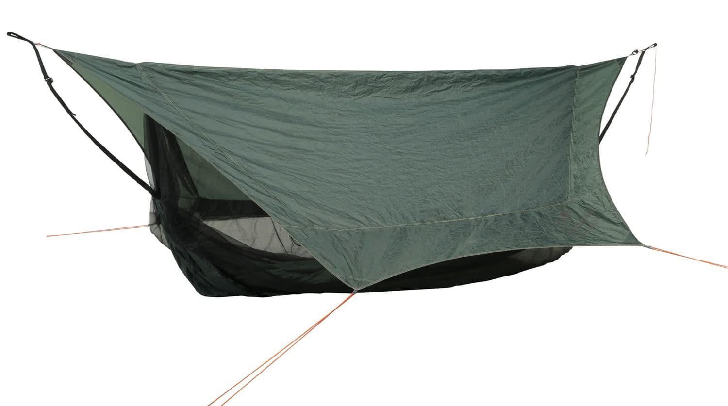 Das Traveller Camp besteht aus einer ultraleichten Hängematte, die über ein extragroßes Moskitonetz fest mit einem Tarp verbunden ist. So hast du Schlafplatz, Moskitonetz und Schutz vor Wind und Regen in einem. Farbe grün Geeignet für 1 Abmessungen Liegefläche 275 x 140 Gesamtlänge 295 cm Belastbark