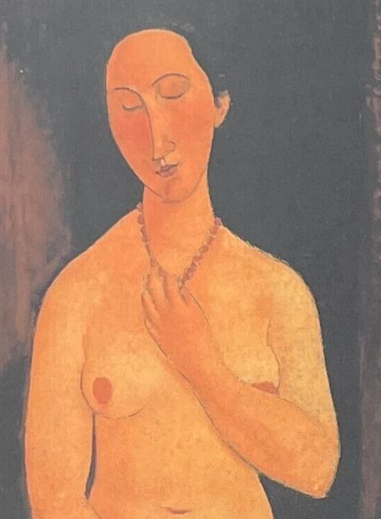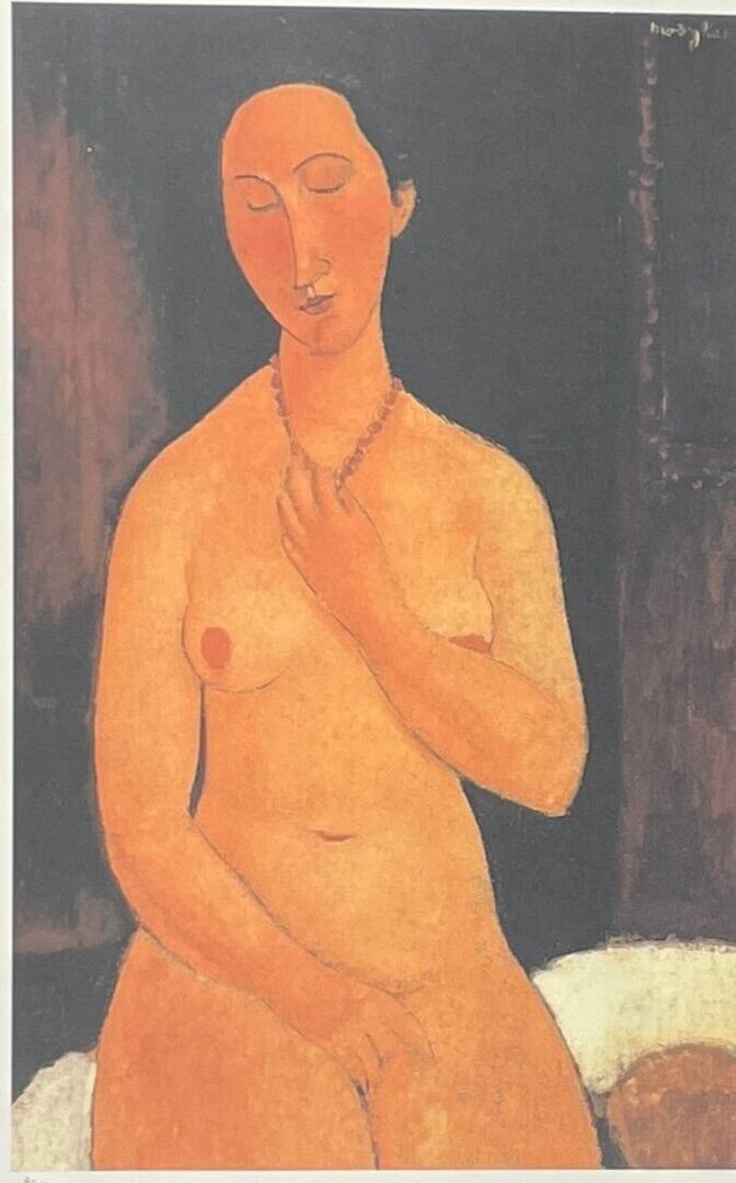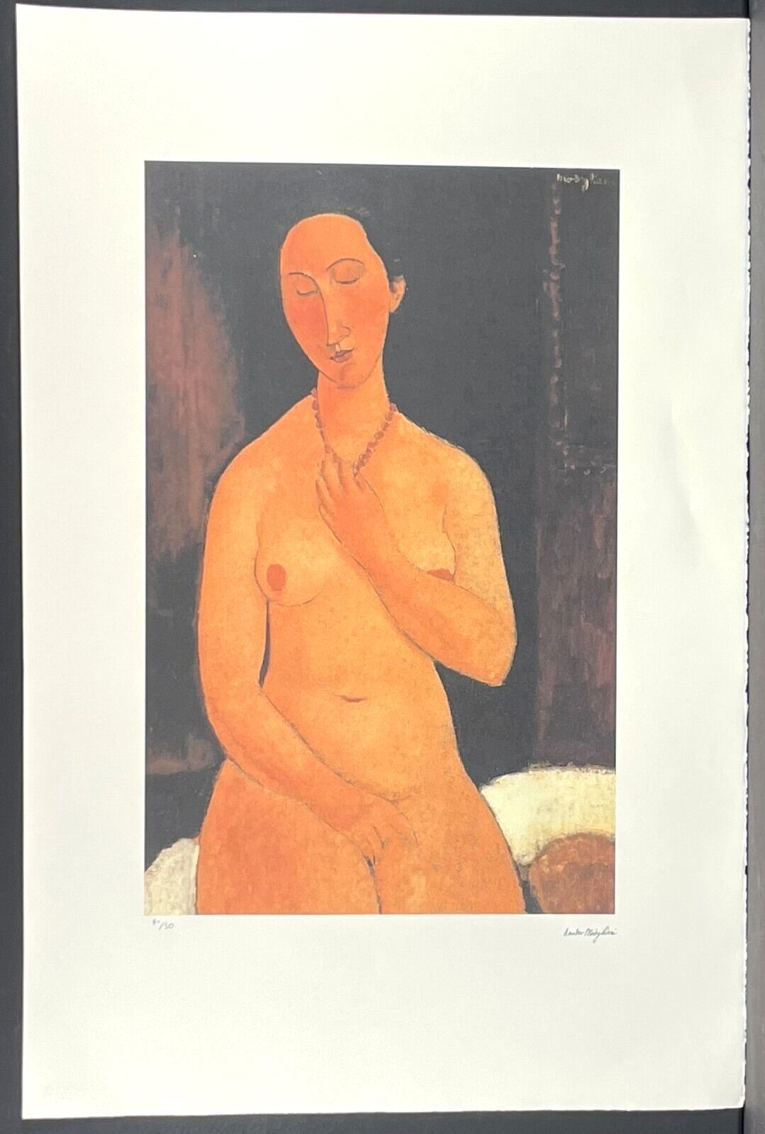 Lithographie Sitzender Akt mit Halskette In der Platte signiert und mit der Hand nummeriert Trockenstempel Limitierte Auflage von 50 Stück Jedes Stück ist einzeln nummeriert 41 50 Gesamtgröße : 51 cm x 78 cm Nach dem Original von Amedeo Modigliani Auf Hahnemuhle Papier Das Blatt wird flach verschick