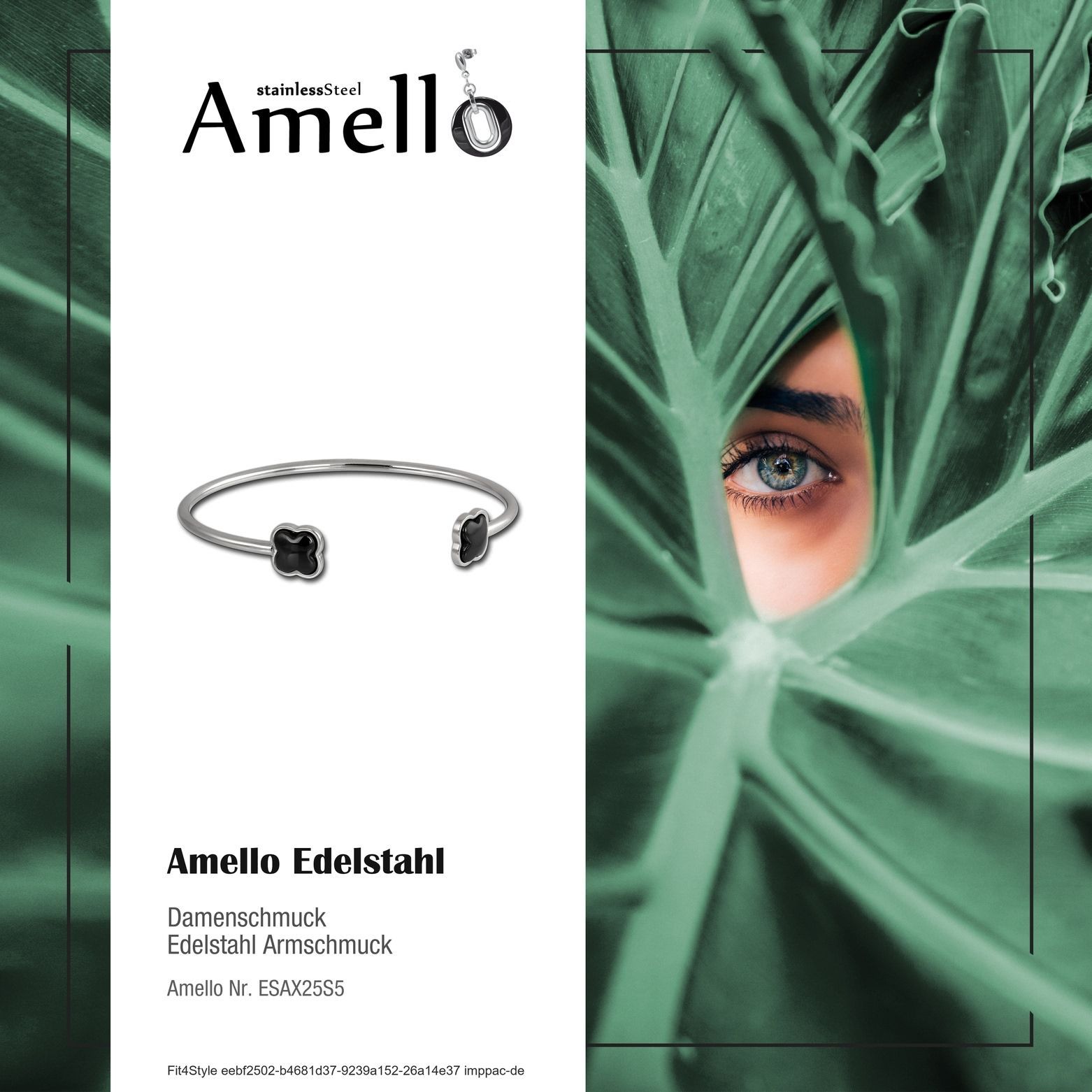 Ein Amello Marken-Armreifen Kleeblatt mit der Bestellnummer ESAX25S5 für Damen in der Farbe silber schwarz. Der schöne Edelstahl Keramik Armschmuck ist aus der Amello Edelstahlschmuck Kollektion.