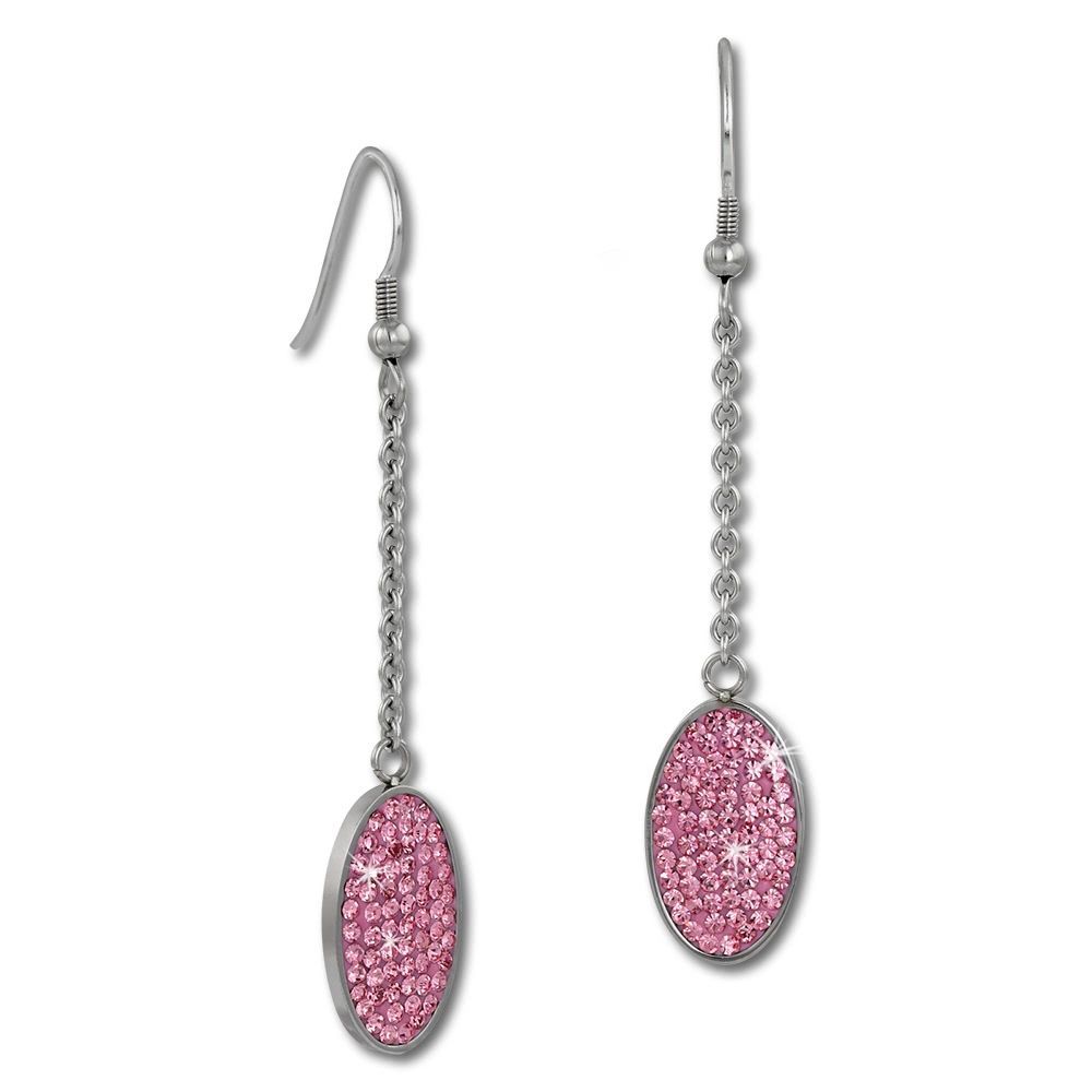 Ohrhänger und Armband -Oval- aus Edelstahl, besetzt mit rosafarbenen Zirkonia-Steinen. Das 18cm lange Armband besitzt ein 3cm Verlängerungskettchen. Die Länger der Ohrringe beträgt 3,8 cm. Ein Schmuckset aus unserem Amello-Edelstahl-Sortiment.