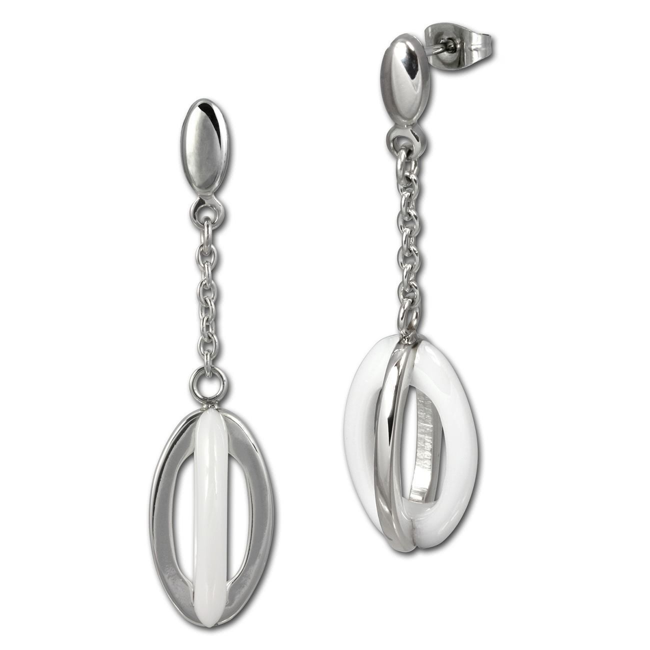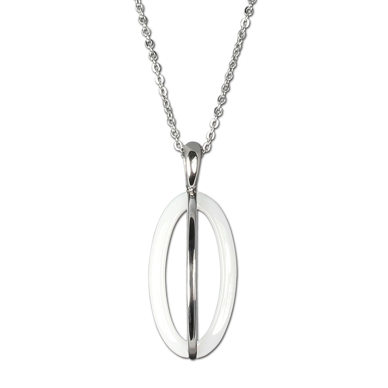 Stilvoll, edles Schmuck-Set aus Edelstahl und Keramik -Ellipse-, weiß edelstahl - beinhaltet: Halskette und Ohrringe - aus dem Amello-Edelstahl-Sortiment.