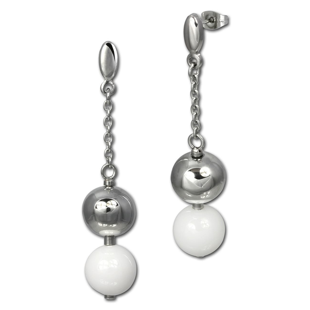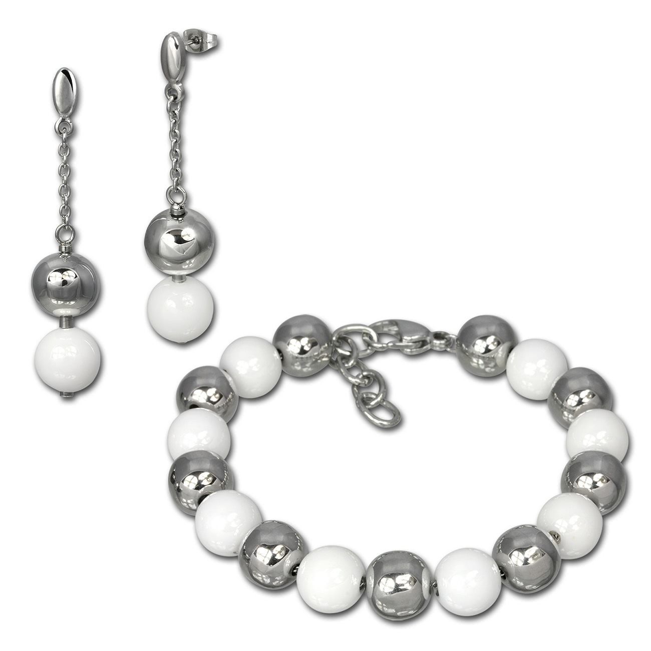 Stilvoll, edles Schmuck-Set aus Edelstahl und Keramik -Kugel-, weiß edelstahl - beinhaltet: Armband und Ohrringe - aus dem Amello-Edelstahl-Sortiment.