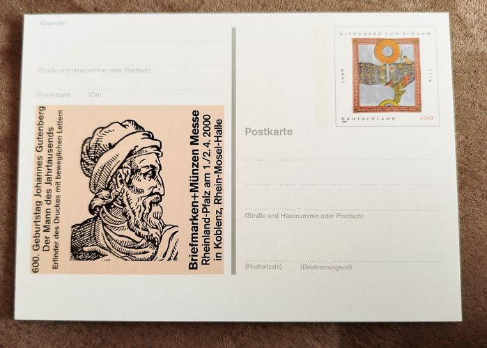 Bei dem gezeigten Objekt handelt es sich um eine Gedenkpostkarte (Ganzsache), die anlässlich der Briefmarken+Münzen Messe Rheinland-Pfalz vom 1. bis 2. April 2000 in der Rhein-Mosel-Halle in Koblenz herausgegeben wurde. Details zum Sammlerstück Anlass: Die Messe feierte unter anderem den 600. Geburt