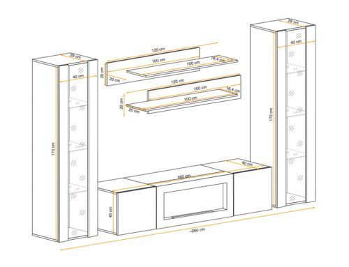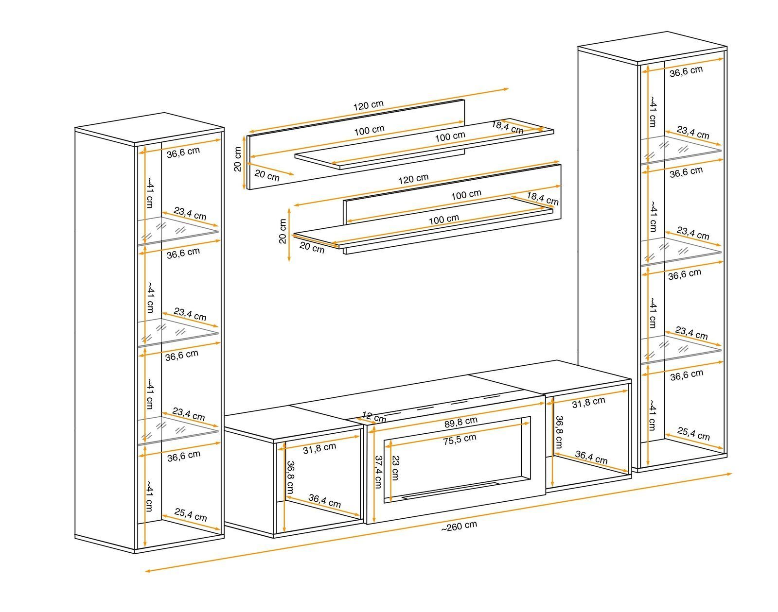 Anbauwand Wohnwand FLY M2 ZZ PVC Hochglanz Push Click mit Bio Ethanol Kamin Led. Beschreibung Hängevitrine: PVC Hochglanzfront, beidseitig montierbar. Innen drei Glasablagen. Zwei Stk. im Set. Tv - Tisch: links und rechts je eine PVC Hochglanzfront, innen ein offenes Fach. In der Mitte ein Ethanol K