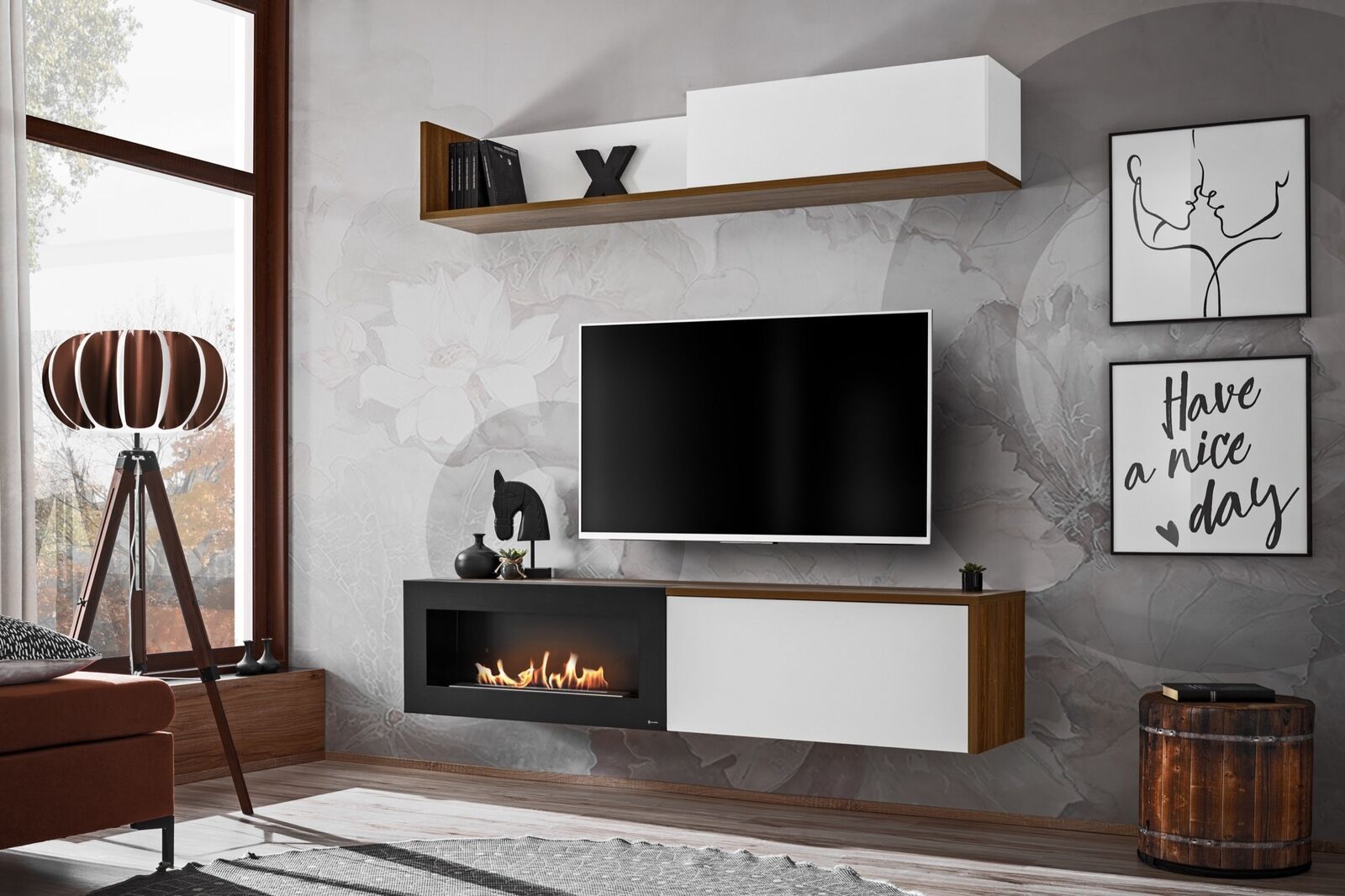 Anbauwand Sideboard Wohnwand Schrankwand DALLAS B Bio-Ethanol Kamin Push Click. Beschreibung Tv - Tisch: mit einer Klappe, innen ein offenes Fach, links ein Bio-Ethanol Kamin (ohne Scheibe). Klappenhalter enthalten . Wandregal: rechts eine Klappe, innen ein offenes Fach. Klappenhalter enthalten . In