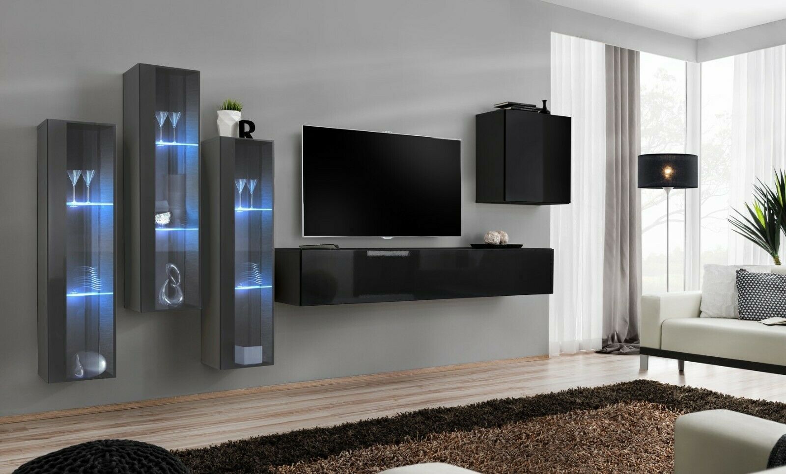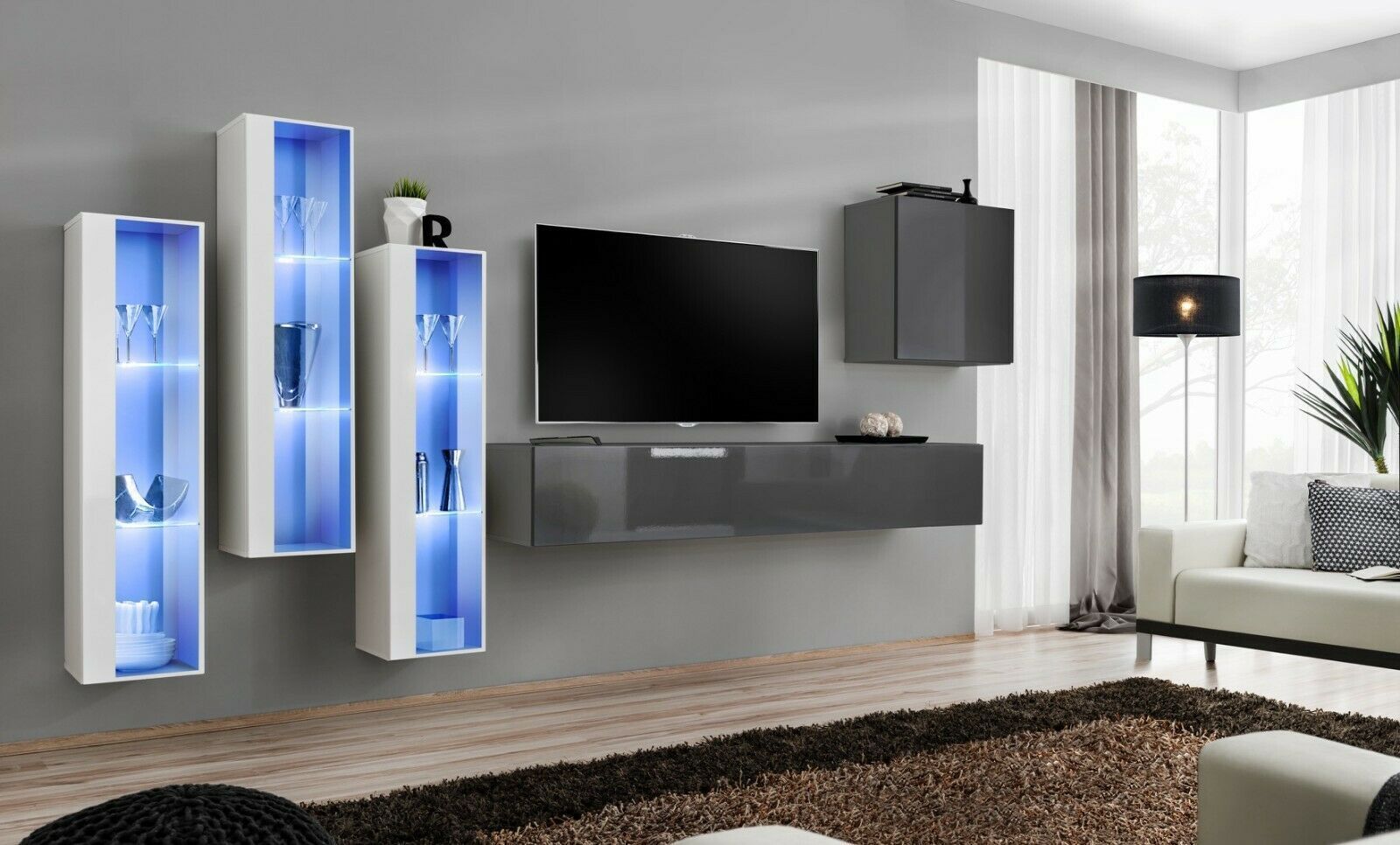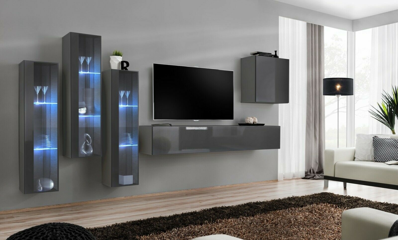 Anbauwand Wohnwand Schrankwand SWITCH XIII Graphit Hochglanz PVC Push-Click LED