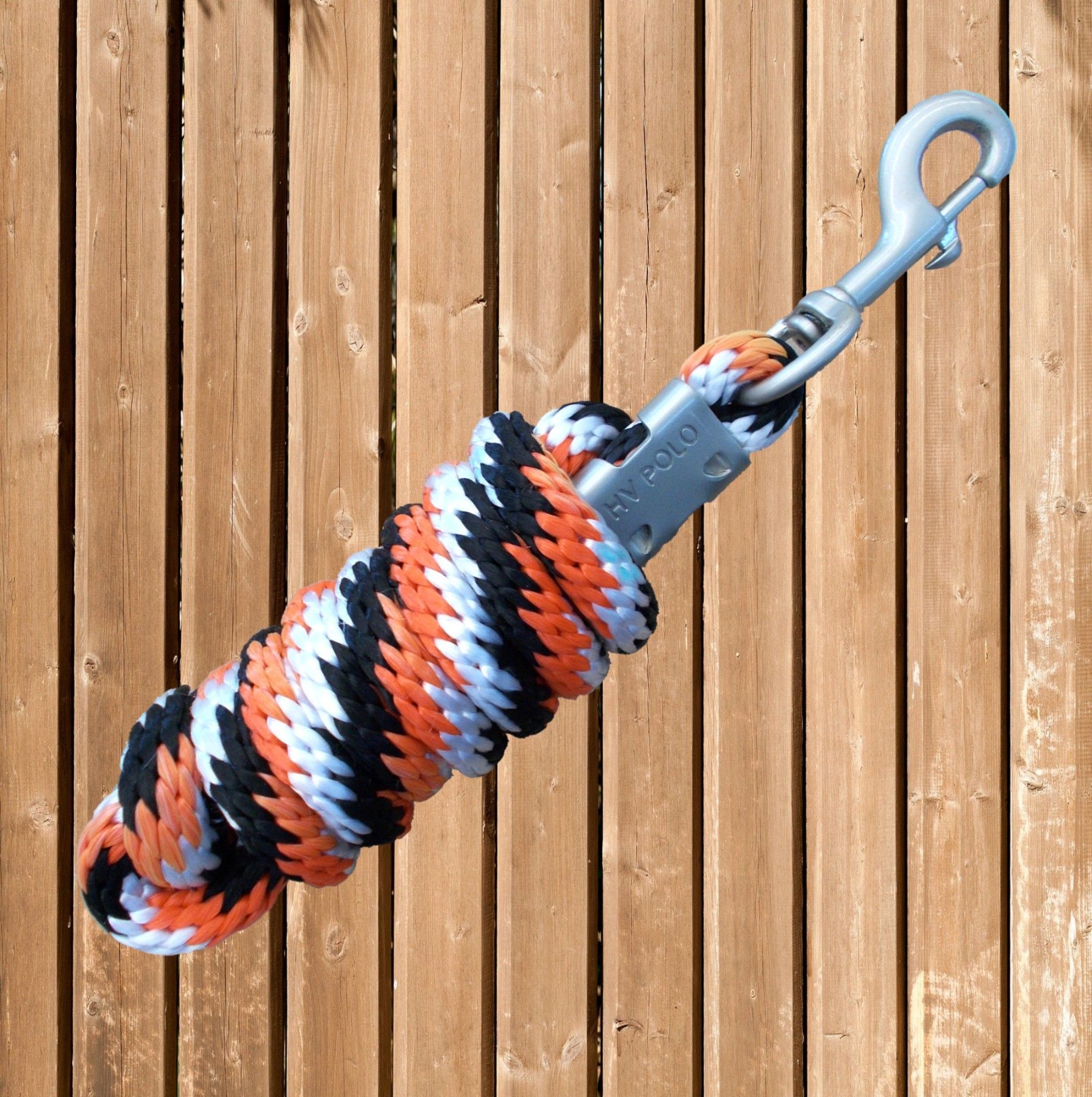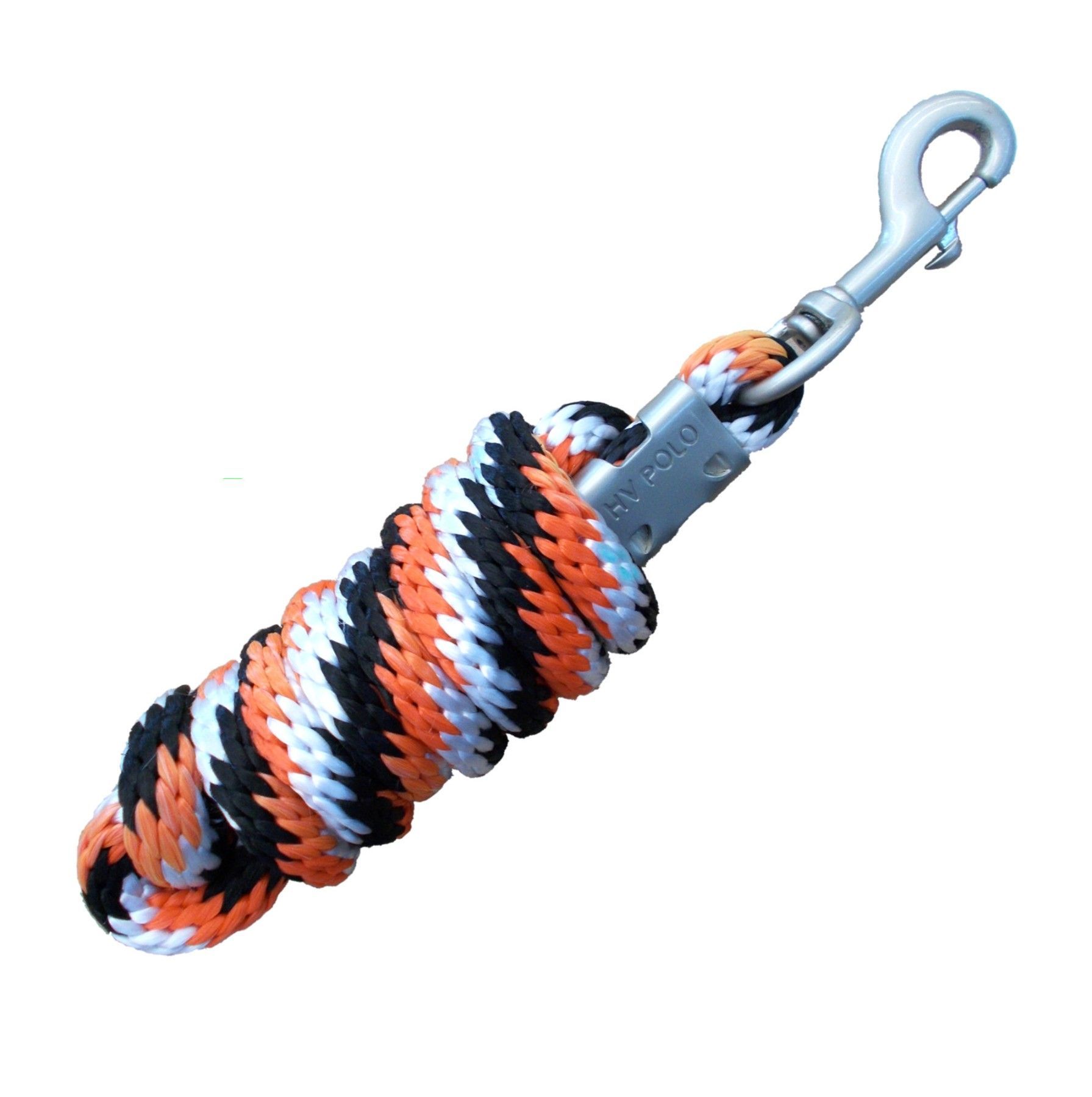 HV Polo Anbindestrick · spiral geflochtener Anbindestrick aus besonders strapazierfähigem Polypropylen · großer, matter silberfarbener Karabinerhaken · Länge: ca. 2,2 m · Farbe: orange-weiß-schwarz Bildschirmfarben können abweichen.
