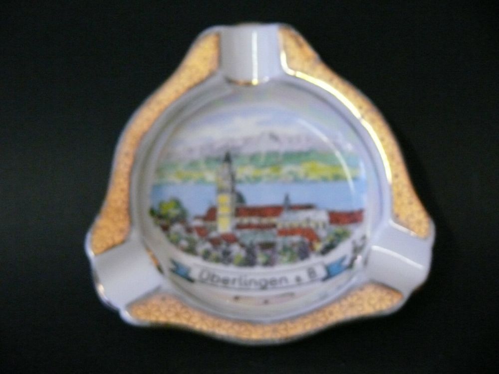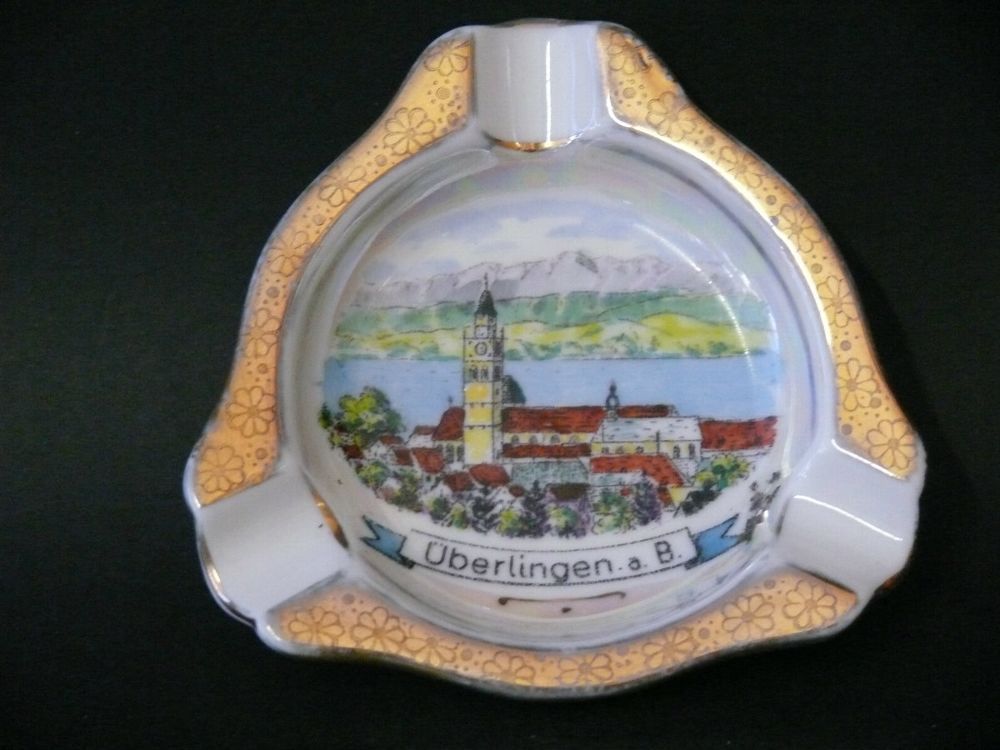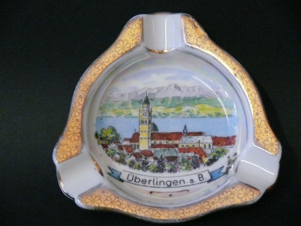 Porzellan Ansicht von Überlingen am Bodensee Rovadi kunst Handarbeit - Exklusive Design Andenken Porzellan Aschenbecher Sehr Schöne 3 Eckige Aschenbecher mit 3 Ablage und Goldene Rand Porzellan Ansicht von Überlingen am Bodensee Rovadi kunst Handarbeit Motiv : Überlingen am Bodensee Hersteller Boden