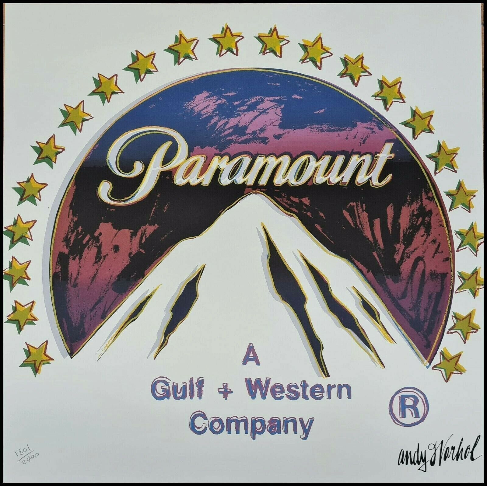 Lithographie Paramount In der Platte signiert und mit der Hand nummeriert Limitierte Auflage von 2400 Stück Jedes Stück ist einzeln nummeriert Nummer kann vom Bild abweichen Gesamtgröße : 60 cm x 60 cm Nach dem Original von Andy Warhol Dies ist keine original signierte, sondern eine plattensignierte