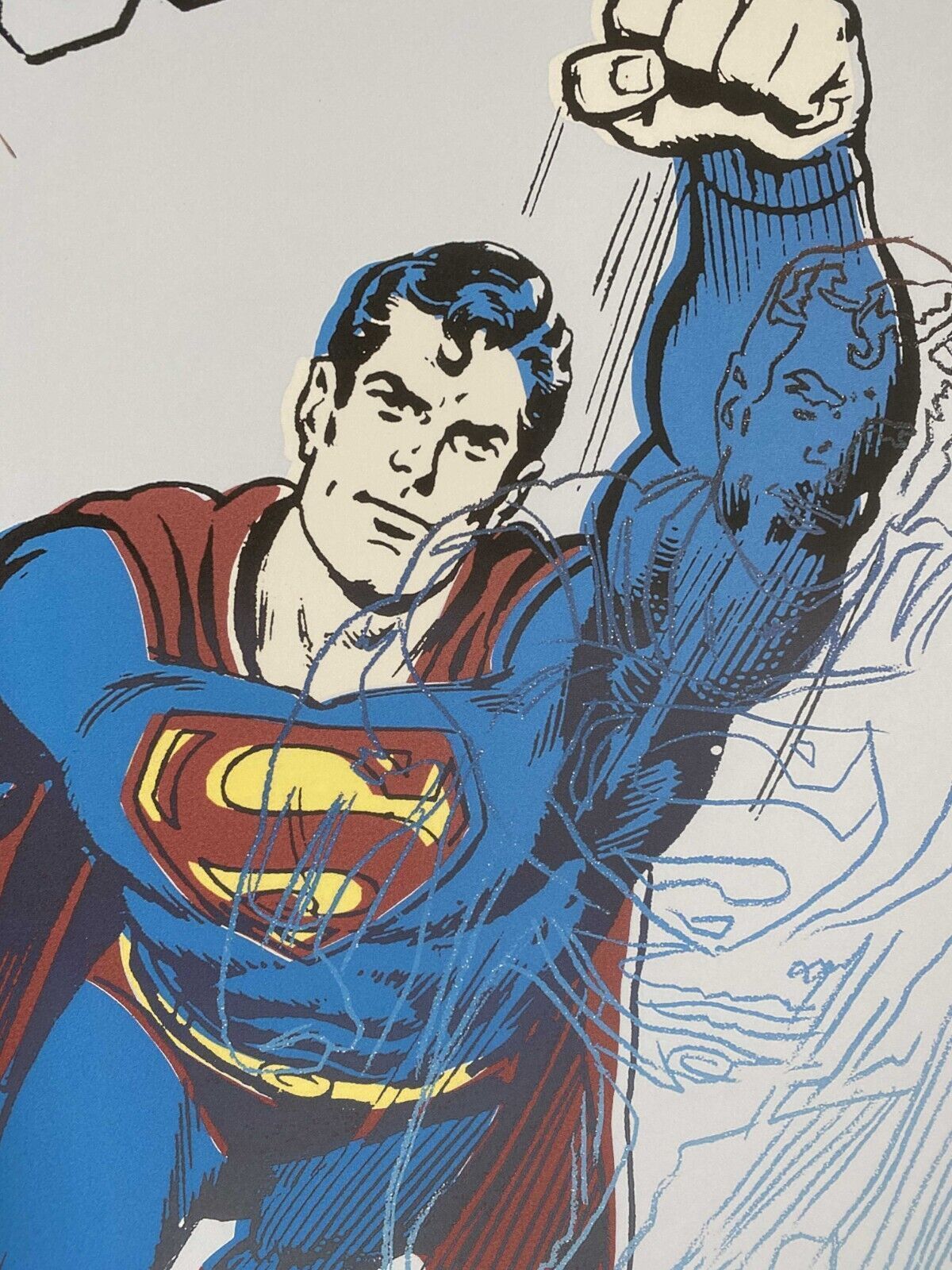 Lithographie Superman In der Platte signiert und mit der Hand nummeriert Limitierte Auflage von 100 Stück Jedes Stück ist einzeln nummeriert 33 100 Gesamtgröße : 57 cm x 38 cm Hologrammsticker von Grafy Nach dem Original von Andy Warhol Wasserzeichen auf Arches France Papier Das Blatt wird flach ver
