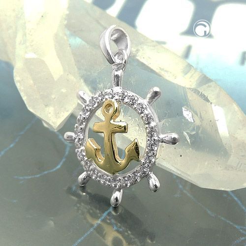 Anhänger 16mm Steuerrad mit Anker bicolor mit Zirkonias Silber 925
