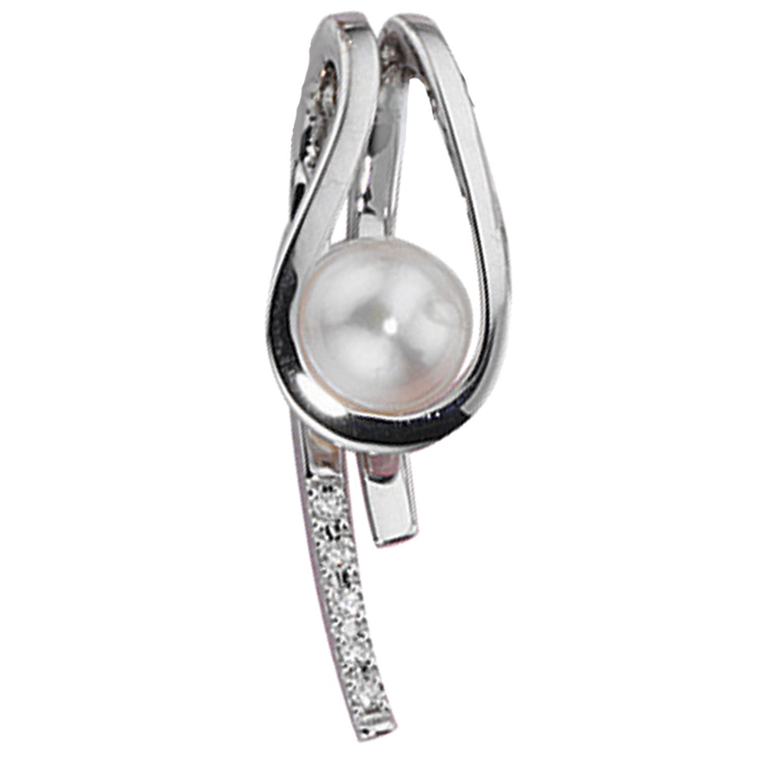 Anhänger aus 14 Karat (585) Weißgold mit einer Süßwasser-Zuchtperle und 5 Diamant-Brillanten, 0,04 ct., W/SI wesselton (weiß), SI=(kleine, mit bloßem Auge nicht erkennbare natürliche Einschlüsse), Feinbearbeitung gut, Höhe ca. 29,3 mm, Breite ca. 9,9 mm,