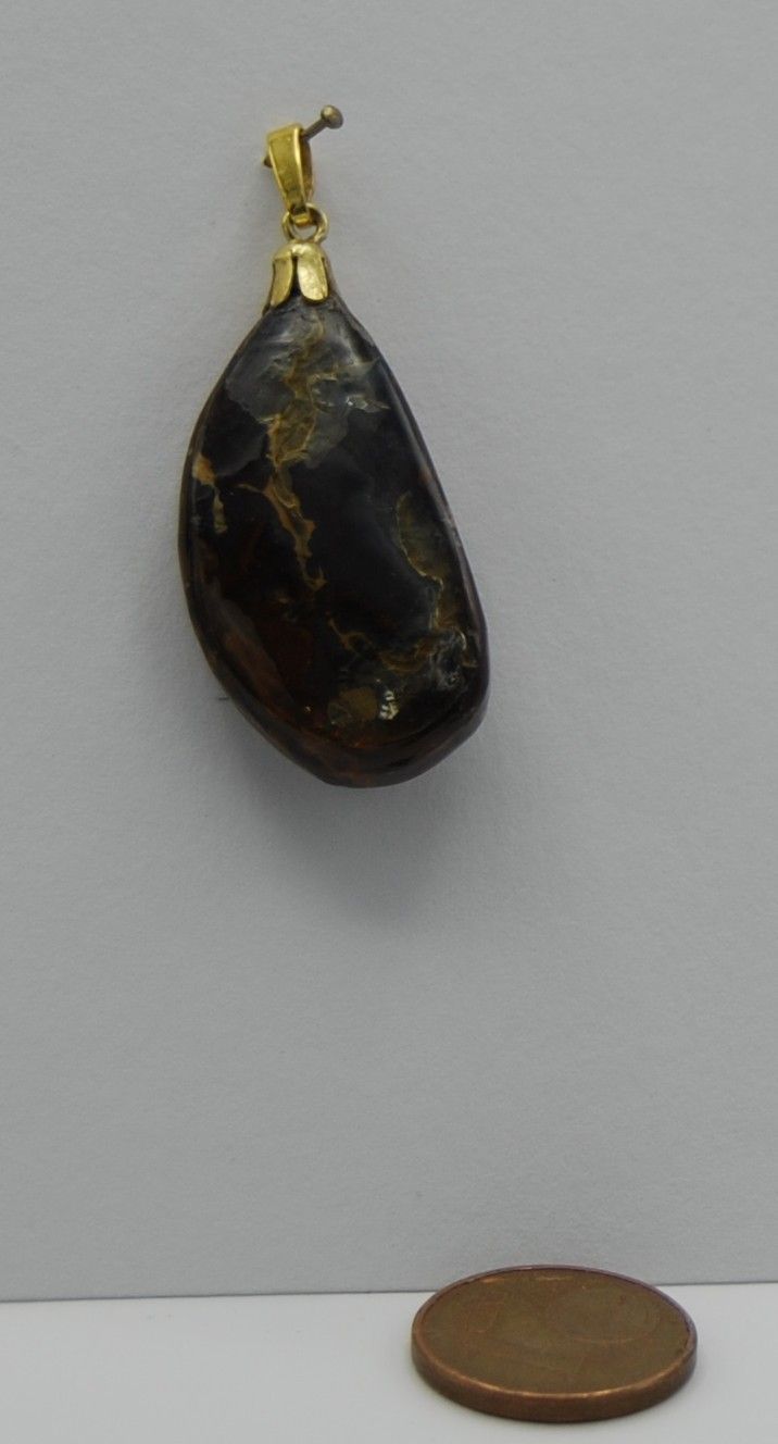 Der Anhänger wiegt gut 6 Gramm und ist mit der Öse 40 mm lang. Der ist in Natur Tönen marmoriert und trägt Adern. Sieht man auf dem Foto leider nicht so schön. Der Anhänger ist 333 gestempelt. Ich habe noch mehr Schmuck eingestellt. Bei Fragen stehe ich Ihnen auch gern persönlich zur Verfügung.