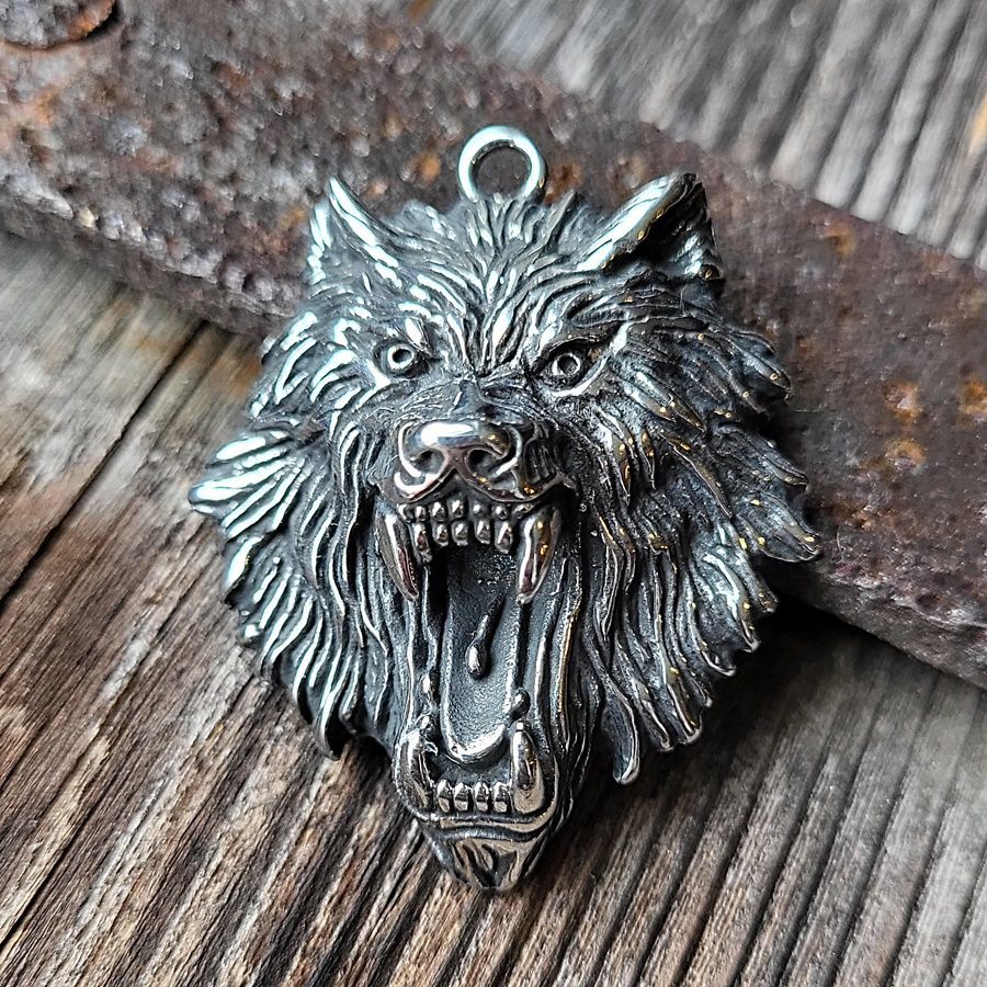 Anhänger Fenriswolf, aus massivem Edelstahl. Maße: 45 mm x 40 mm x 12 mm, Gewicht: 26 g