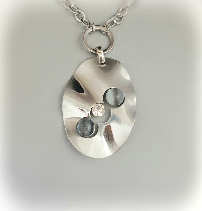 Silberfarbener Anhänger inkl. Kette. Der Anhänger besteht aus Metall und ist mit Steinen verziert. Die Größe des Anhängers beträgt inkl. Öse ca. 48mm x 33mm. Die Kette ist aus silberfarbenem Metall / farbigem Wachsband und hat eine Länge von ca. 41-47