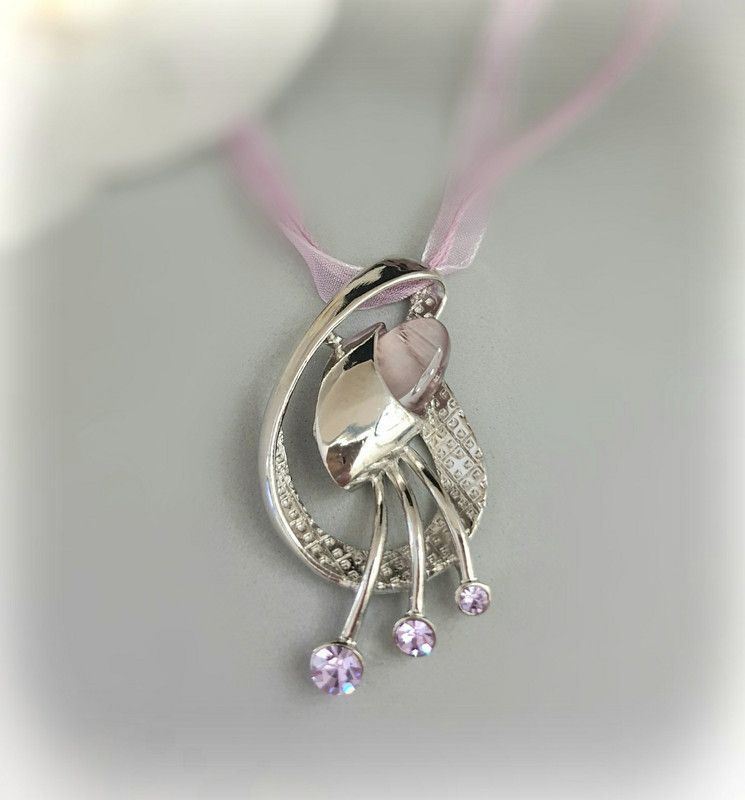 Silberfarbener Anhänger inkl. Kette. Der Anhänger besteht aus Metall und ist mit Steinen verziert. Die Größe des Anhängers beträgt inkl. Öse ca. 54mm x 26mm. Die Kette ist aus farbigem Stoffband / Wachsband und hat eine Länge von ca. 43-50 cm.