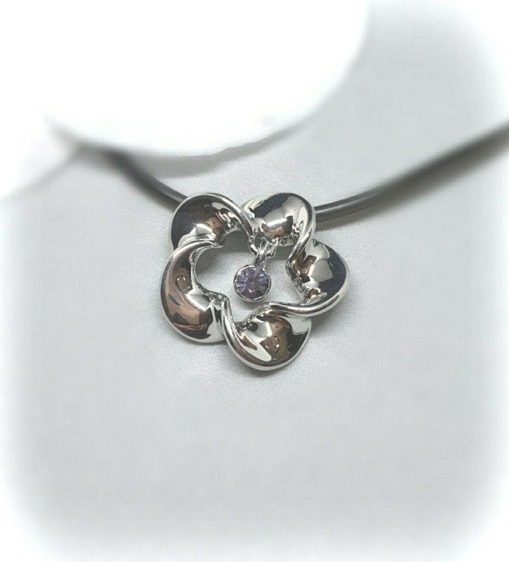 Silberfarbener Anhänger inkl. Kette. Der Anhänger besteht aus Metall und ist mit Steinen verziert. Die Größe des Anhängers beträgt inkl. Öse ca. 23mm x 23mm. Die Kette ist aus schwarzem Kautschukband und hat eine Länge von ca. 41-48 cm.