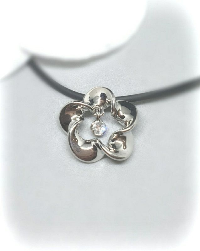 Silberfarbener Anhänger inkl. Kette. Der Anhänger besteht aus Metall und ist mit Steinen verziert. Die Größe des Anhängers beträgt inkl. Öse ca. 23mm x 23mm. Die Kette ist aus schwarzem Kautschukband und hat eine Länge von ca. 41-48 cm.