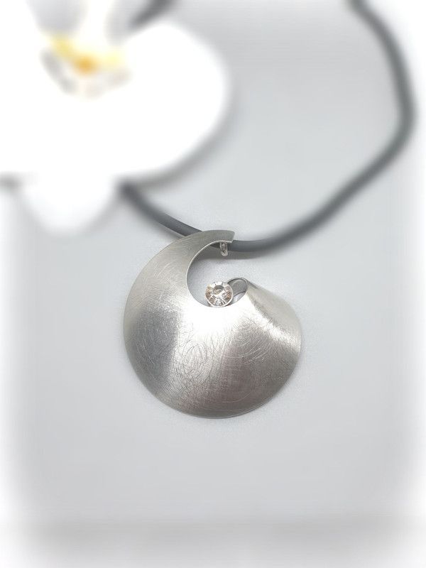 Silberfarbener Anhänger inkl. Kette. Der Anhänger besteht aus Metall und ist mit einem Stein verziert. Die Größe des Anhängers beträgt inkl. Öse ca. 48mm x 44mm. Die Kette ist aus schwarzem Kautschukband und hat eine Länge von ca. 41-48 cm.
