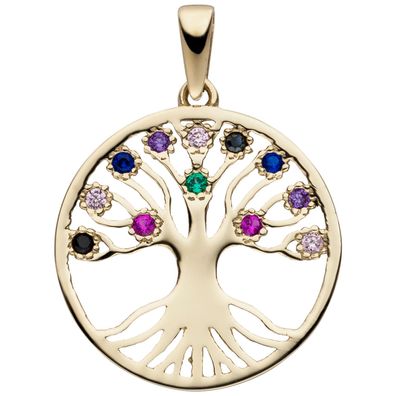 • Anhänger Lebensbaum 333 Gold Gelbgold 12 Zirkonia bunt