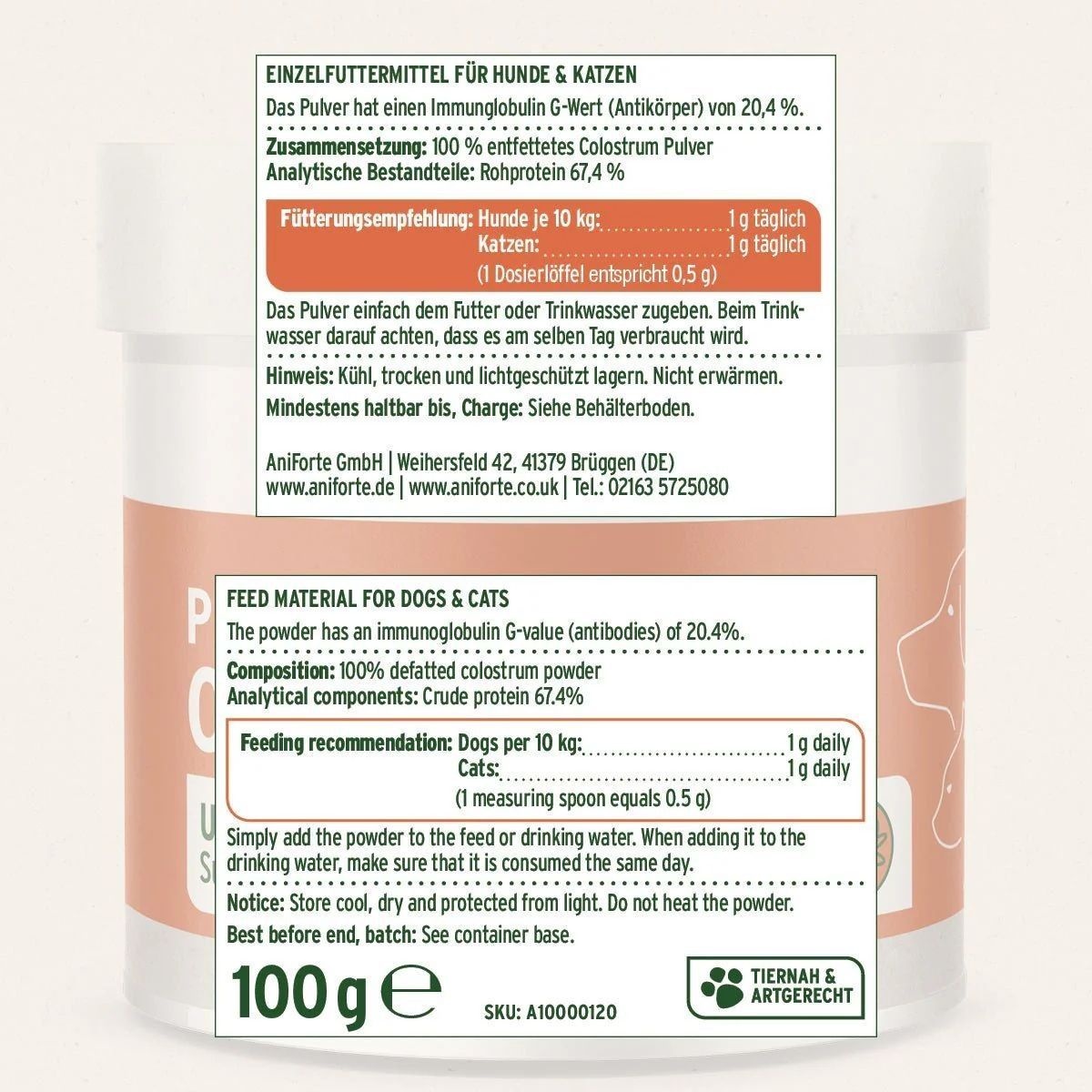 AniForte Premium Colostrum für Hunde & Katzen 100g Pulver - Natürliche Erstmilch, Kolostrum unterstützt Abwehrkräfte & Magen-Darm-Trakt, Immunglobulin G in Lebensmittelqualität