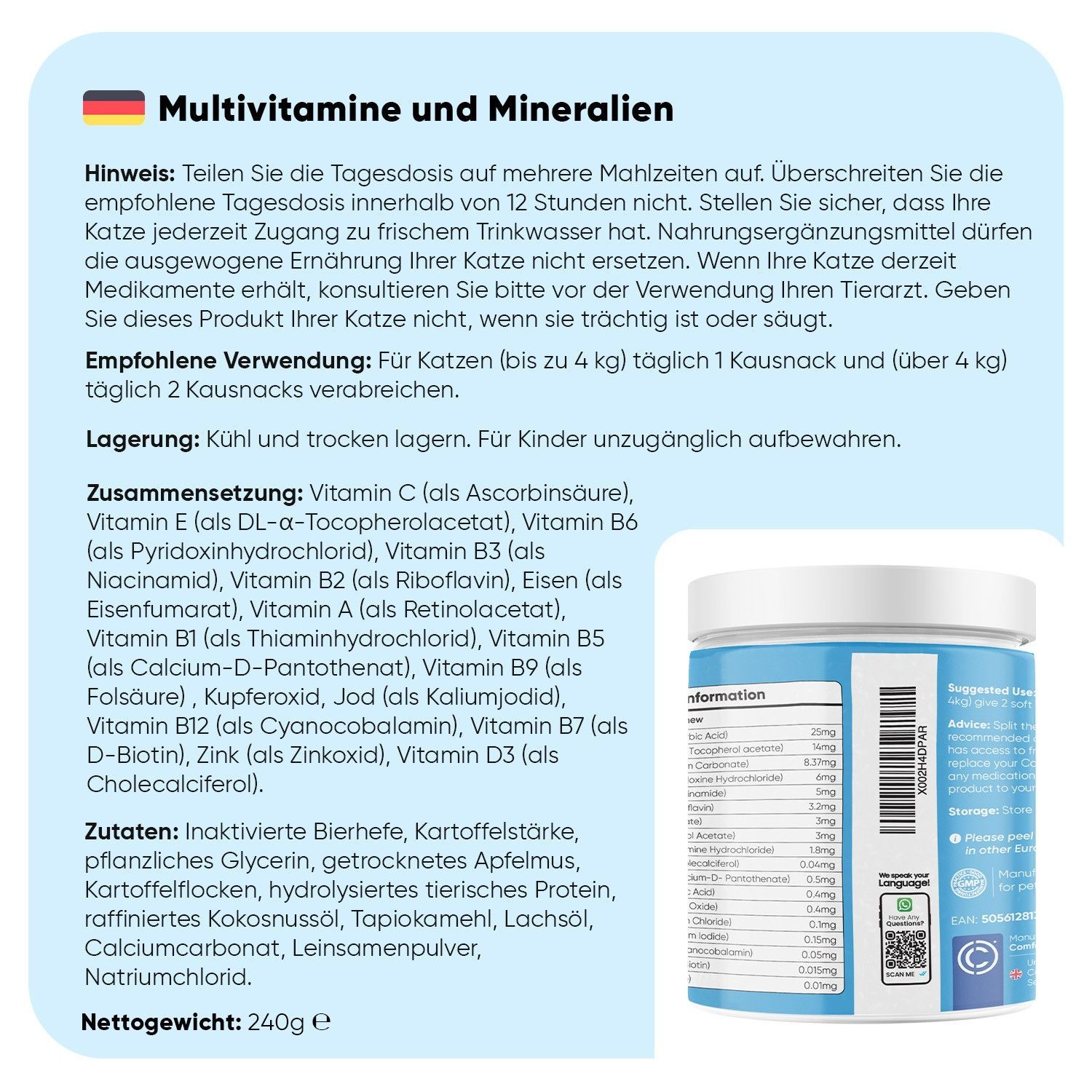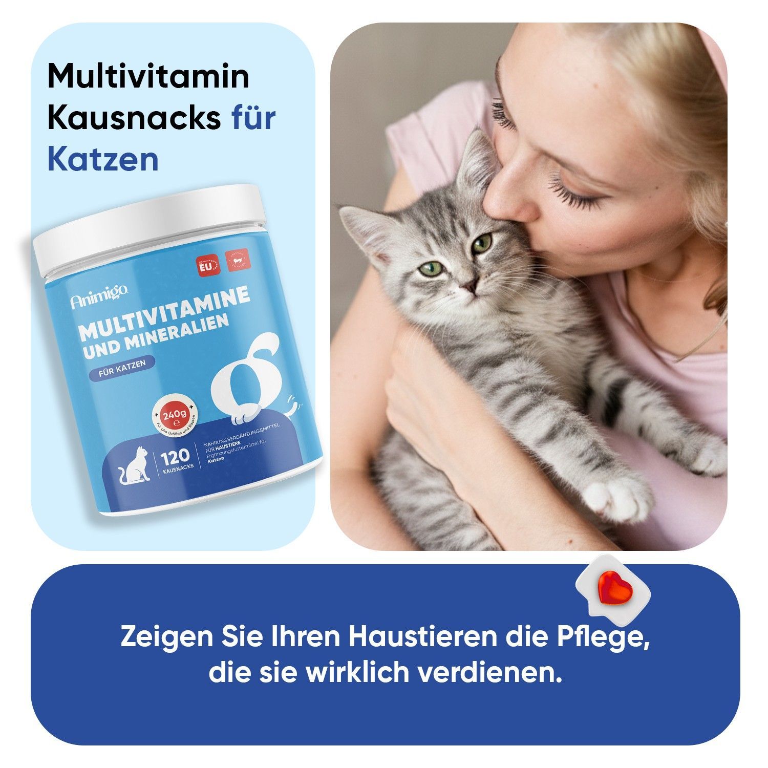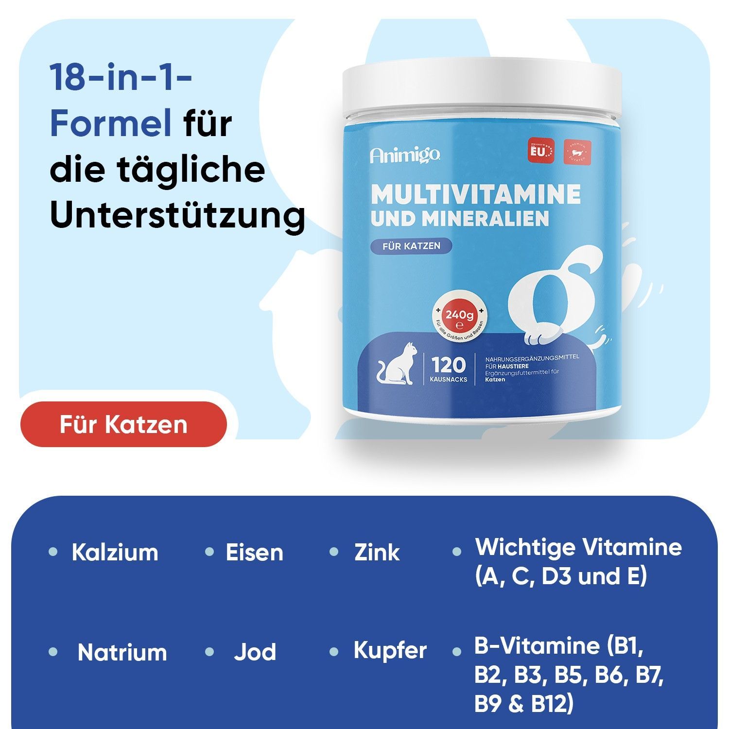 Multivitamin mit Vitamin B Komplex - Animigo Multivitamin Kausnacks für Katzen enthalten starke Zutaten wie die Vitamine A, B1, B2, B3, B5, B6, B7, B9, B12, C, E und D3. Jede Kausnack enthält außerdem wichtige Mineralien wie Kalzium, Eisen, Kupfer, Natrium, Jod und Zink. Diese Multivitamin- & Mineral-Kausnacks wurden für den täglichen Gebrauch entwickelt, unterstützen die natürliche Immunität und eignen sich für Katzen als Teil ihrer regulären Ernährung.