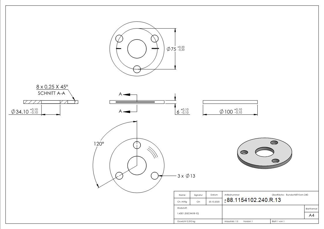 • Ankerplatte Ø 100 x 6mm, mit Rundschliff und Fase, V2A