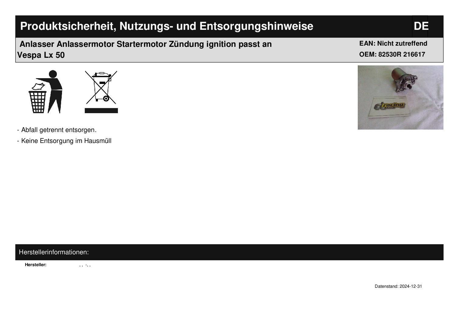 Anlasser Anlassermotor Startermotor Zündung ignition passt an Vespa Lx 50