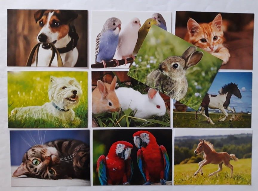 Ansichtskarten Tiere 10er, Postkarten Tier Hund Katze Pferd Hase Papagei Grußkarte