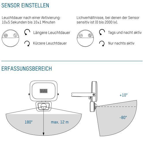 Ansmann LED Strahler / Flutlicht WFL1600S kabelgebunden 20 W mit Bewegungsmelder Das Ansmann WFL1600S Flutlicht kombiniert leistungsstarke Beleuchtung mit intelligenter Sensorik und robustem Design. Entwickelt für den Einsatz im Innen- und Außenbereich, bietet es zuverlässige und effiziente Beleuchtung für anspruchsvolle Anwendungen in Werkstätten, Garagen, Gärten und Baustellen. Der integrierte Bewegungsmelder macht es ideal für Bereiche, die nur bei Bedarf beleuchtet werden sollen. Hauptmerkmale: Integrierter Bewegungsmelder: Der Sensor erfasst Bewegungen in einem Bereich von bis zu 12 Metern und ermöglicht eine flexible Leuchtzeiteinstellung von 10 Sekunden bis 5 Minuten. Die Sensitivität des Bewegungsmelders ist ebenfalls anpassbar, wodurch sich das Licht bei festgelegten Lichtverhältnissen automatisch einschaltet.Leistungsstarke SMD-LED-Technologie: Mit 1.800 Lumen und einer Farbtemperatur von 5000K bietet das Flutlicht eine intensive, natürliche Ausleuchtung mit breitem Abstrahlwinkel. Dies sorgt für eine gleichmäßige Helligkeit, die angenehm für die Augen ist.Robust und wetterbeständig: Dank Schutzart IP54 ist das Gehäuse gegen Staub und Strahlwasser geschützt. Das Aluminiumgehäuse und die Stoßfestigkeit (IK05) machen die Leuchte ideal für anspruchsvolle Umgebungen.Einfache Installation: Mit dem integrierten 20 cm H05RN-F Kabel ist das Flutlicht schnell und flexibel an geringen mechanischen Belastungspunkten im Innen- und Außenbereich anschließbar. Technische Daten: Eingangsspannung: 230V ACLeuchtmittel: LED, 20 W, Lebensdauer bis zu 50.000 StundenLichtleistung: 1.800 Lumen, 2.880 LuxLeuchtweite: Bis zu 54 MeterFarbtemperatur: 5000 K (natürliches Weiß), CRI >80Stoßfestigkeitsgrad: IK05Schutzklasse: IP54Bewegungsmelder: Reichweite bis 12 m, einstellbare Leuchtzeit (10 Sek. bis 5 Min.)Temperaturbereich: Betriebstemperatur -20 bis 50 °C, Lagertemperatur -25 bis 65 °CAbstrahlwinkel: 110° horizontalMontagehöhe: Bis zu 2,99 m Lieferumfang: Ansmann WFL1600S FlutlichtBedienungsanleitung Mit dem Ansmann WFL1600S erhalten Sie eine energieeffiziente und langlebige Beleuchtungslösung, die bei Bewegungen automatisch für Licht sorgt und auf die Ansprüche vielseitiger Arbeitsumgebungen ausgelegt ist. Technische DatenEingangsspannung: 230V ACLeistungsaufnahme bei Nulllast: 0,000 WEnergieeffizienzklasse: FKabellänge: 20 cmLeuchtmittel: LEDLeistung Leuchtmittel: 20 WLebensdauer Leuchtmittel: < 50.000 hLeuchtweite: 54 mLichtstrom: 1.800 LumenHelligkeit: 2.880 LuxFarbtemperatur: 5000 KFarbwiedergabeindex (CRI): RA >80Anlaufzeit 0-60%: 0,3 sIK-Stoßfestigkeitsgrad: IK05Verstellwinkel: 360°Montagehöhe: max. 2.99horizontaler Abstrahlwinkel: 110 °Farbe: schwarzVerpackung: KartonLagertemperatur: -25 - 65 °CBetriebstemperatur: -20 - 50 °CGehäusematerial: Aluminium