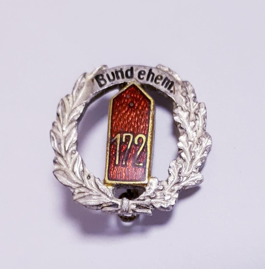 Anstecknadel des Bundes Ehemaliger des 3.Oberelsässischen Infantrieregiment 172 K Gewicht: ca. 2 g Durchmesser: ca. 1,7 cm Zustand: gut - gebraucht/getragen (Abnutzungs- sowie Tragespuren kommen vor)