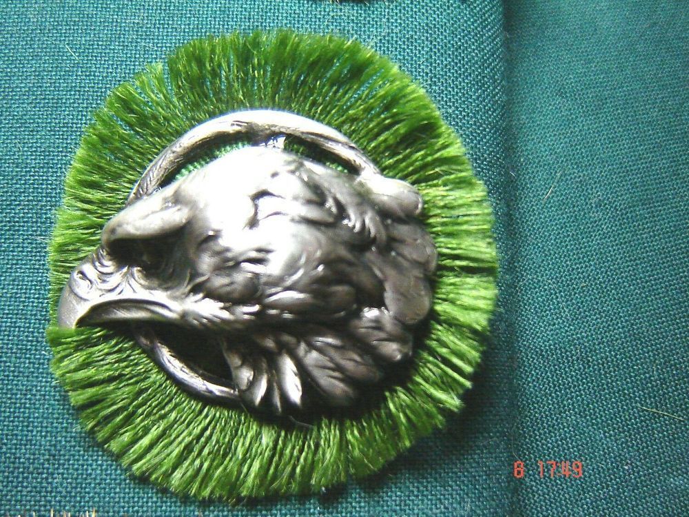 Anstecknadel Hutabzeichen Jagd schöner Adlerkopf versilbert mit Rüsche grün s-p