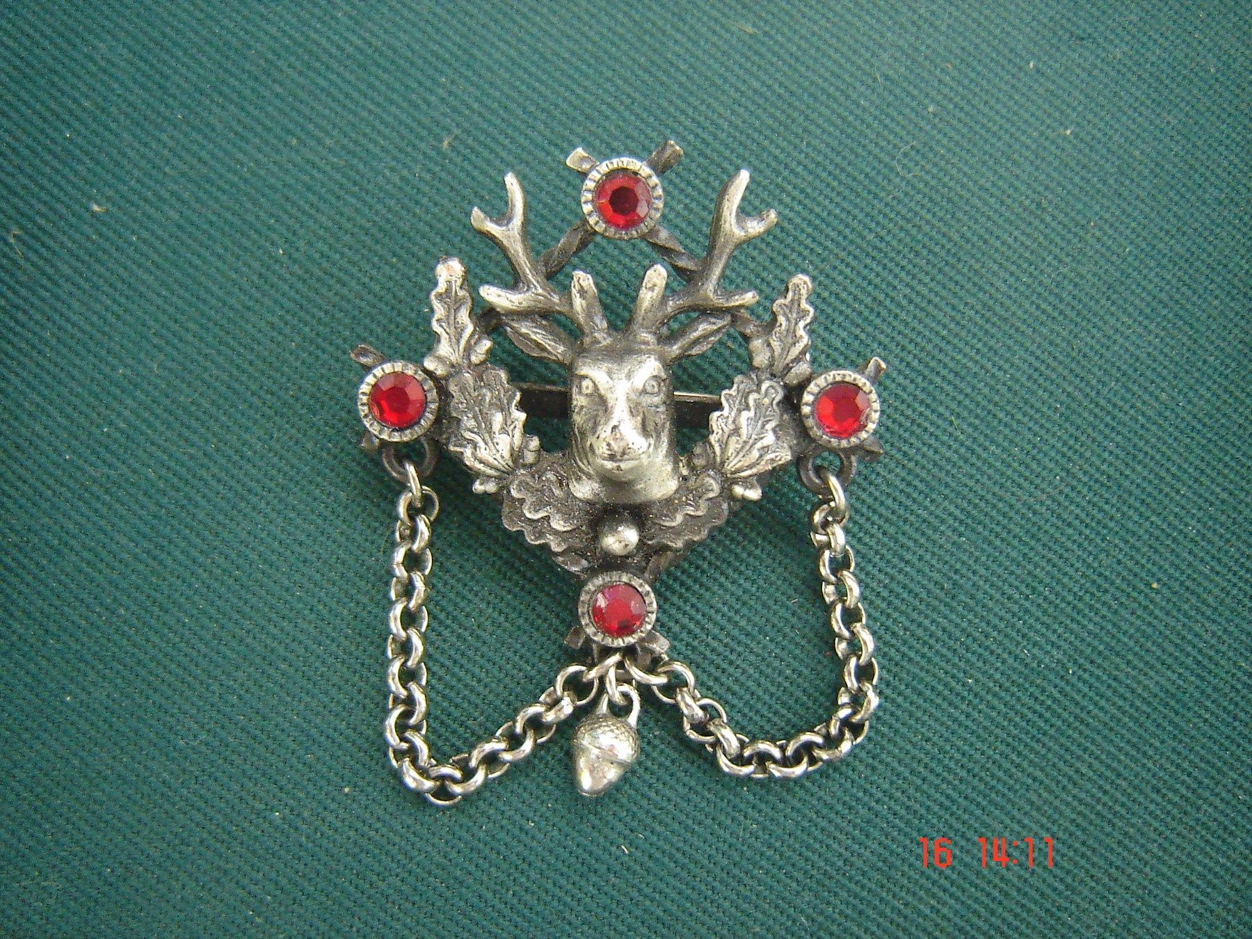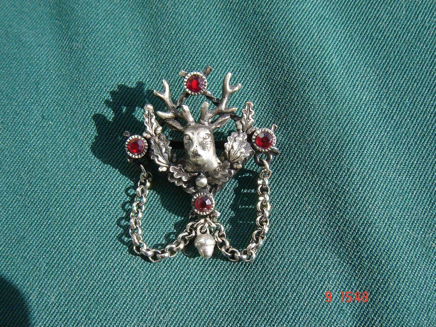 Anstecknadel Jagdbrosche Hirsch mit Kettchen und Steinen rot Hutabzeichen s-p