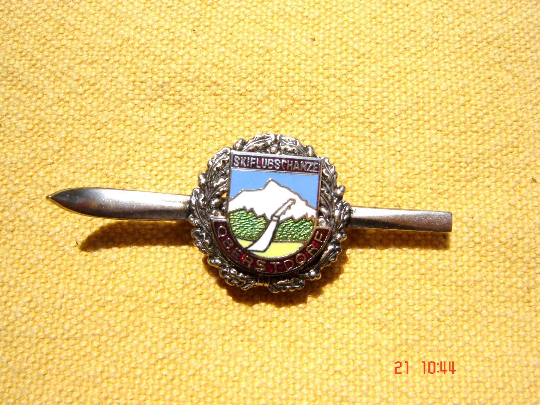 Anstecknadel Ski silberfarben mit Plakette "Skiflugschanze Oberstdorf" emailliert s-p