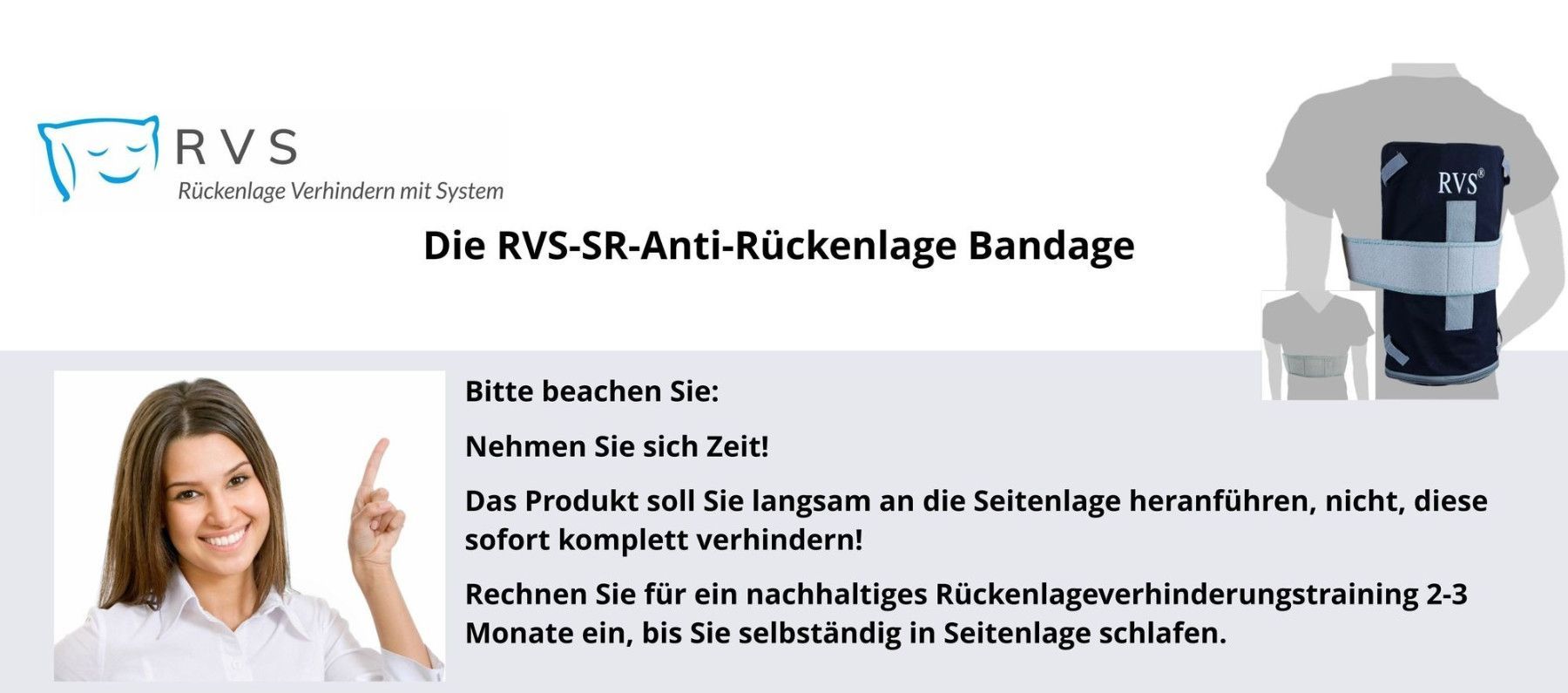 • Rückenlageverhinderungsprodukte sind zur Anwendung durch erwachsene, gesunde Menschen konzipiert. Ein Produkt zum Lagetraining nimmt Einfluss auf die Schlafposition. Es verhindert ein Drehen des Körpers im Schlaf in Richtung Rückenlage. Es darf daher nur verwendet werden, wenn aus medizinischer Gesamtbetrachtung nichts dagegen spricht, die Drehbewegung des Körpers im Schlaf in Richtung Rückenlage zu verhindern.