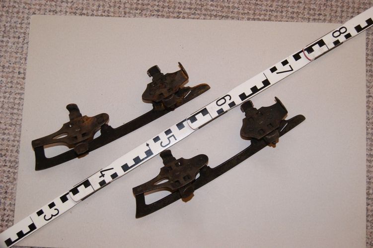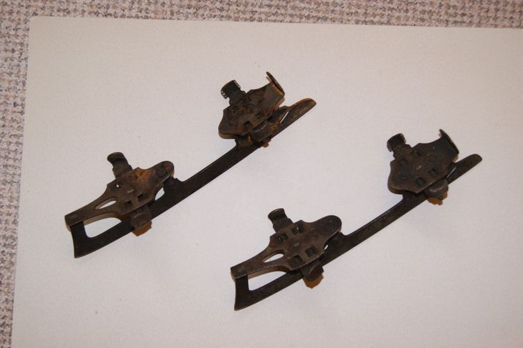 Ein gebrauchtes und später eingelagertes Paar alte Schlittschuhe wie abgebildet. Die Schlittschuhe wurden an die Schuhsohle geklemmt und dann festgezogen (Vierkantschlüssel). Der Vierkantschlüssel ist nicht im Lieferumfang enthalten, weil hier nicht vorhanden. Einige Bereiche sind mit oberflächliche