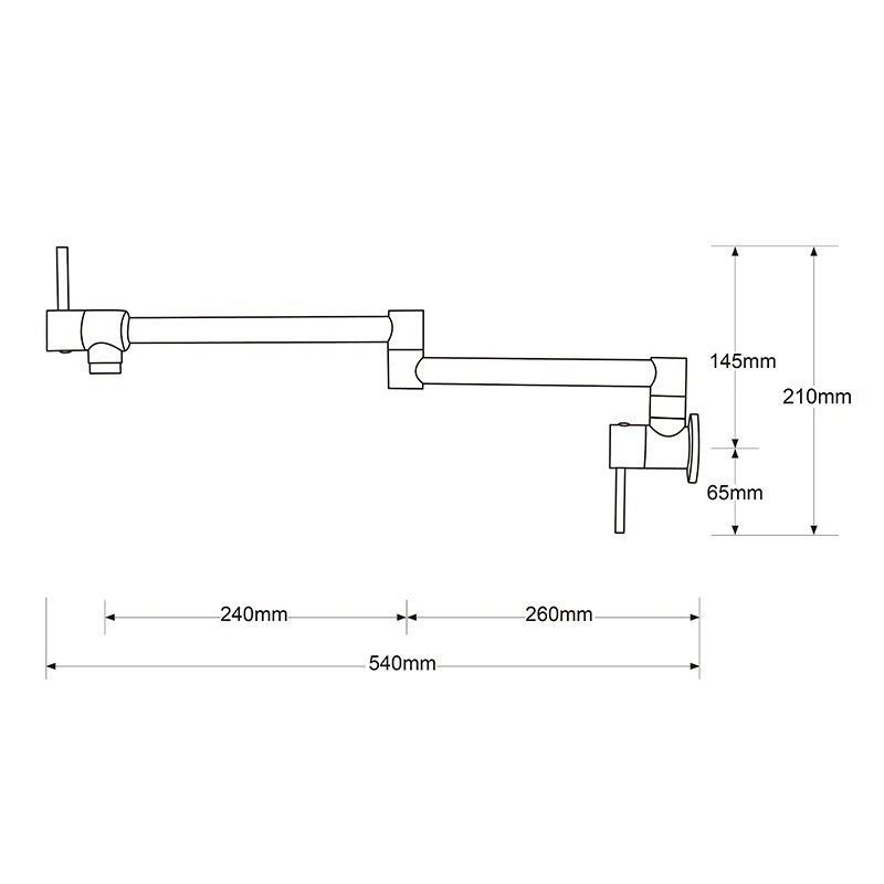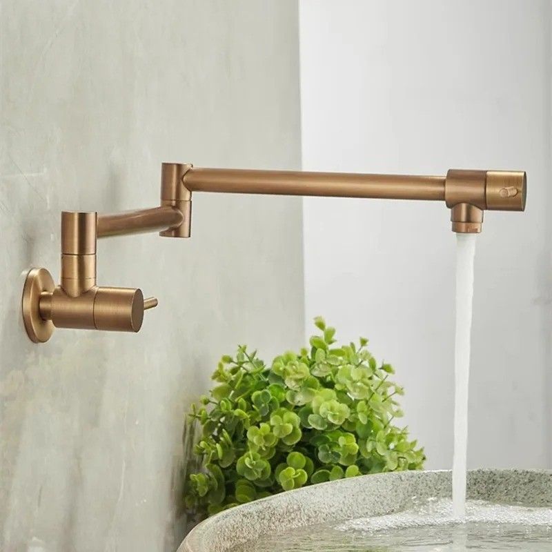 Antique bronze wall-mounted pot filler tap with a foldable single cold spout. Black finish, brass construction, and a rotating folding spout for flexible use over stoves and sinks. Easy installation.
