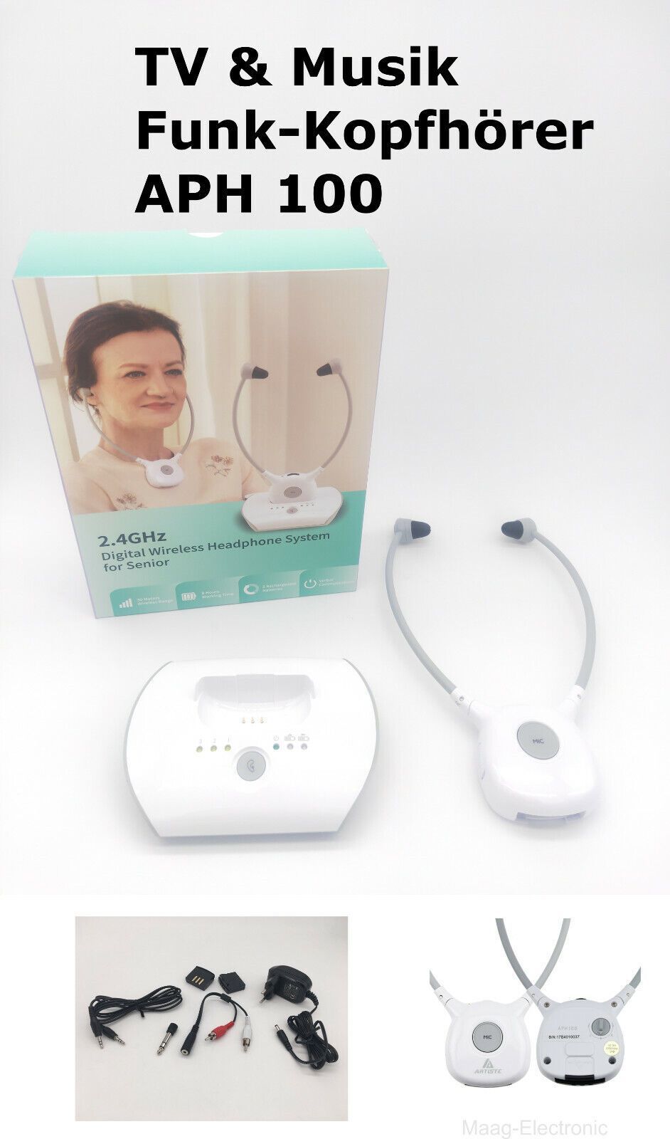 APH100 Funkkopfhörer für TV & Musik, 2,4 GHz TV Kopfhörer Drahtlos mit 2 Akku`s
