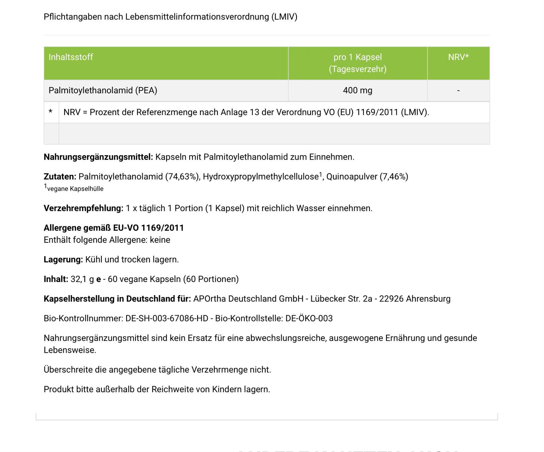 Aportha PEA - Palmitoylethanolamid 400 mg - 60 vegane Kapseln