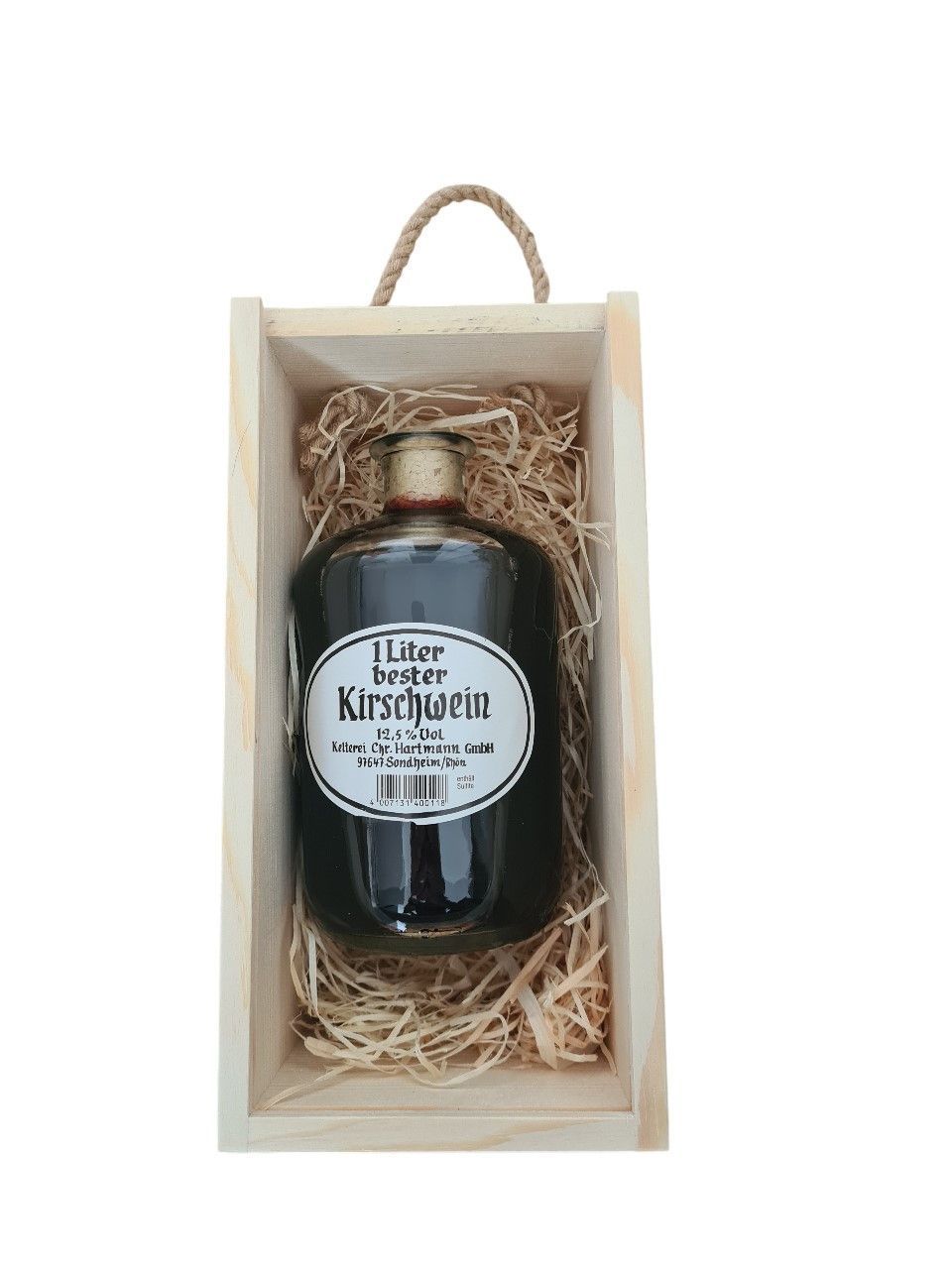 • Geschenk Apothekerflasche Fruchtwein Kirschwein mit Holzbox und Tragekordel