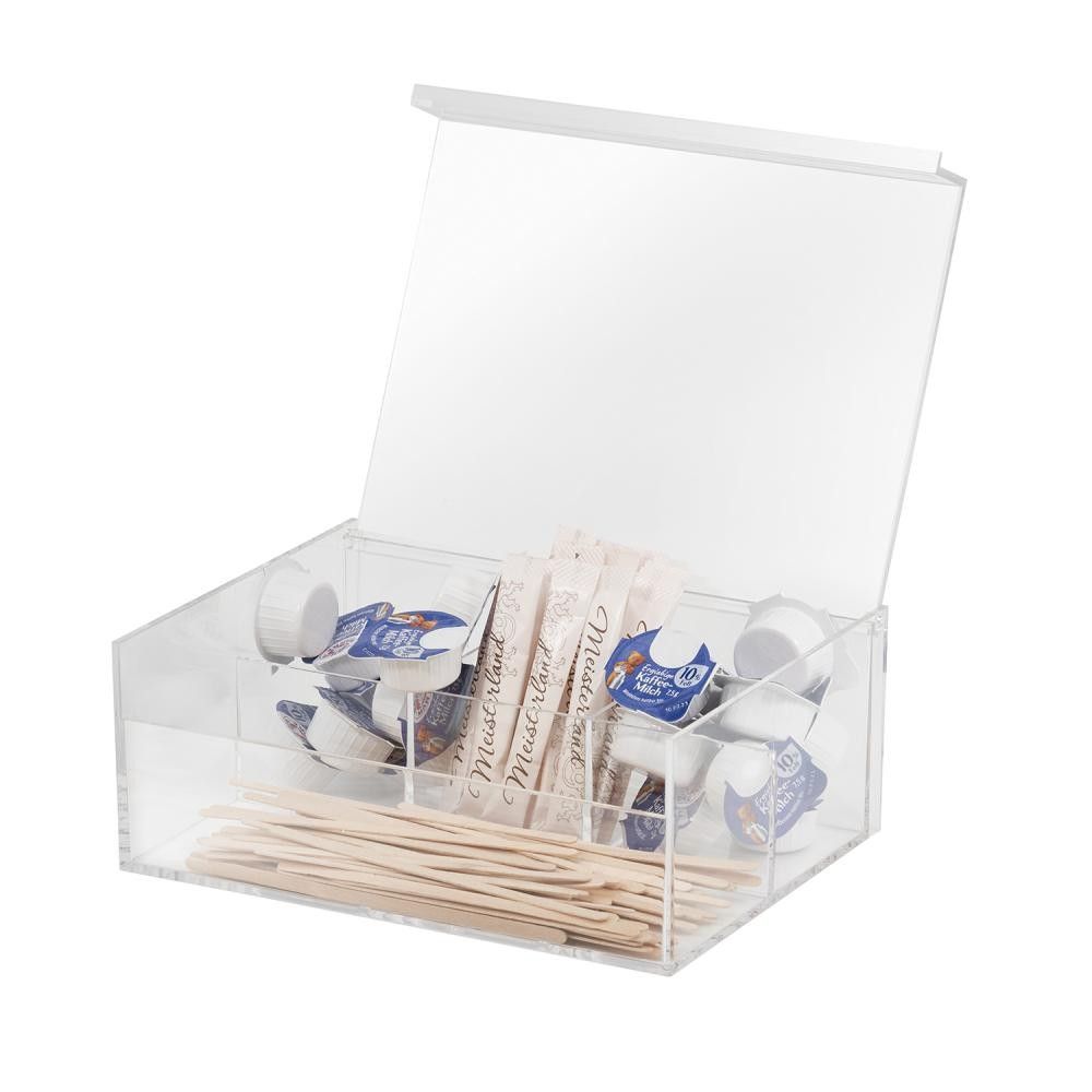 Teebox bzw. Multibox mit 4 Fächern Ausführung: hergestellt aus MS Kunststoff 3 Fächer für kuvertierte Teebeutel 1 Fach für Zucker, Kekse, etc. aufklappbarer Deckel nicht spülmaschinengeeignet Maße: 22 x 17 x 9 cm