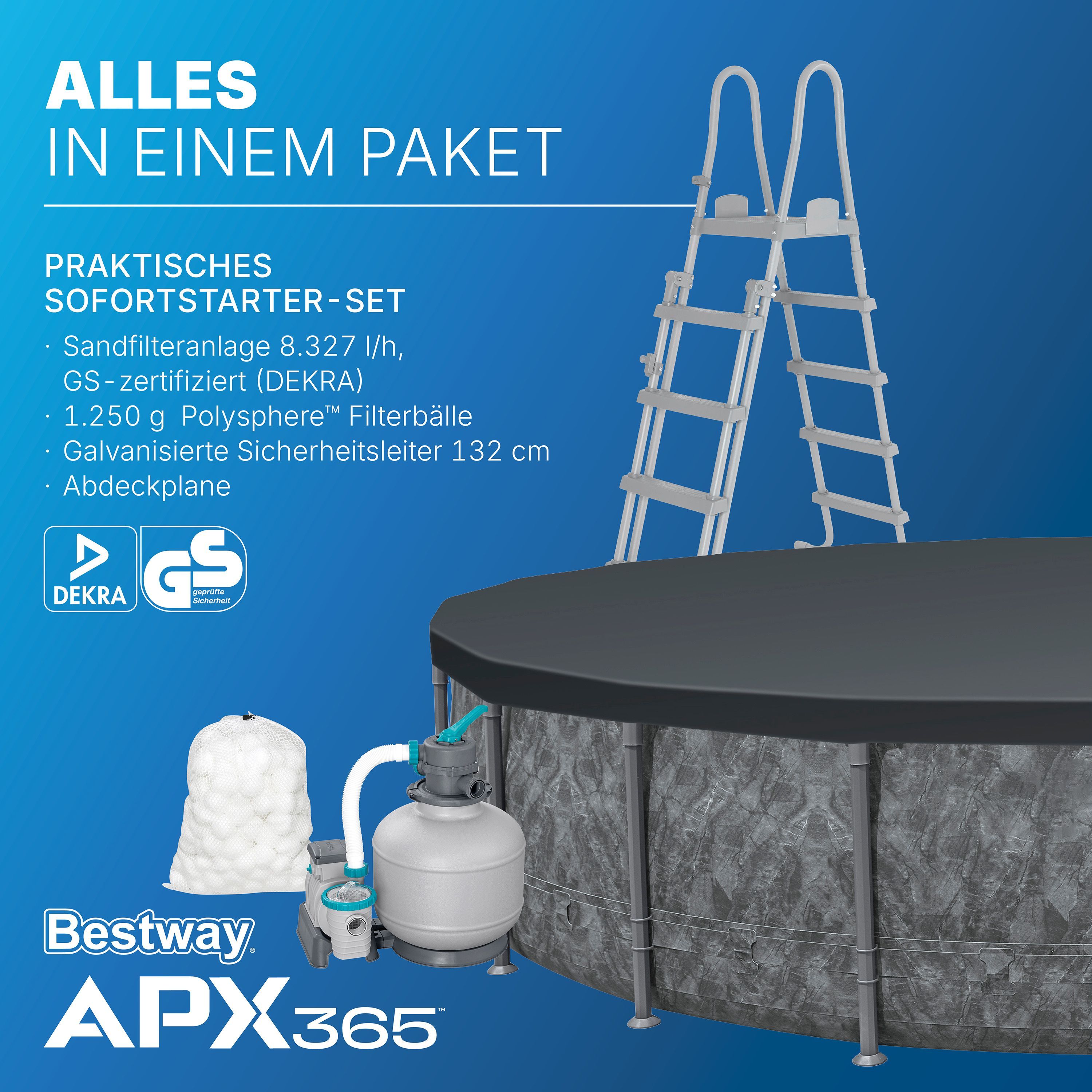 Bestway. APX365™ Winterfestes Frame Pool Komplett-Set mit Sandfilteranlage Ø 671 x 132 cm,