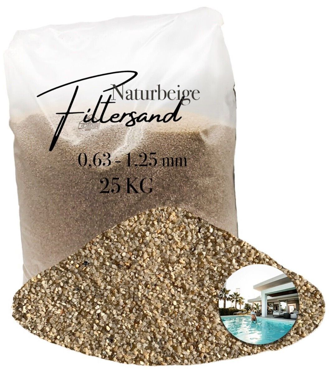 Filtersand in Naturbeige mit einer mittelfeinen Körnung von 0,63-1,25 mm ist die ideale Wahl für den Einsatz in Poolanlagen, Brunnenfiltern und Wasseraufbereitungssystemen. Er wurde nach DIN-Standards mehrfach gewaschen, getrocknet und gesiebt und ist vollständig frei von organischen Rückständen. Egal ob in privaten Sandfilteranlagen oder in gewerblichen Wassertechniksystemen - dieser Quarzsand erfüllt höchste Anforderungen an Reinheit, Hygiene und Filtrationsleistung. Durch die gleichmäßige