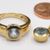 Das Set ist stabil und solide gearbeitet. Es wiegt zusammen 6,5 Gramm und ist in einem absolut neuwertigen Zustand. Auch die Steine, vermutlich Aquamarine, könnten aber auch Topase sein, sind wie neu. Der Ringkopf ist 10 mm breit und der Anhänger hat einen Durchmesser von 9,5 mm. Der Ring hat einen Innendurchmesser von 1,8 cm. Alle Teile sind mit 333 gestempelt.